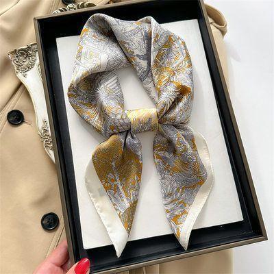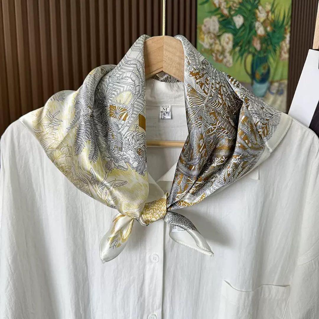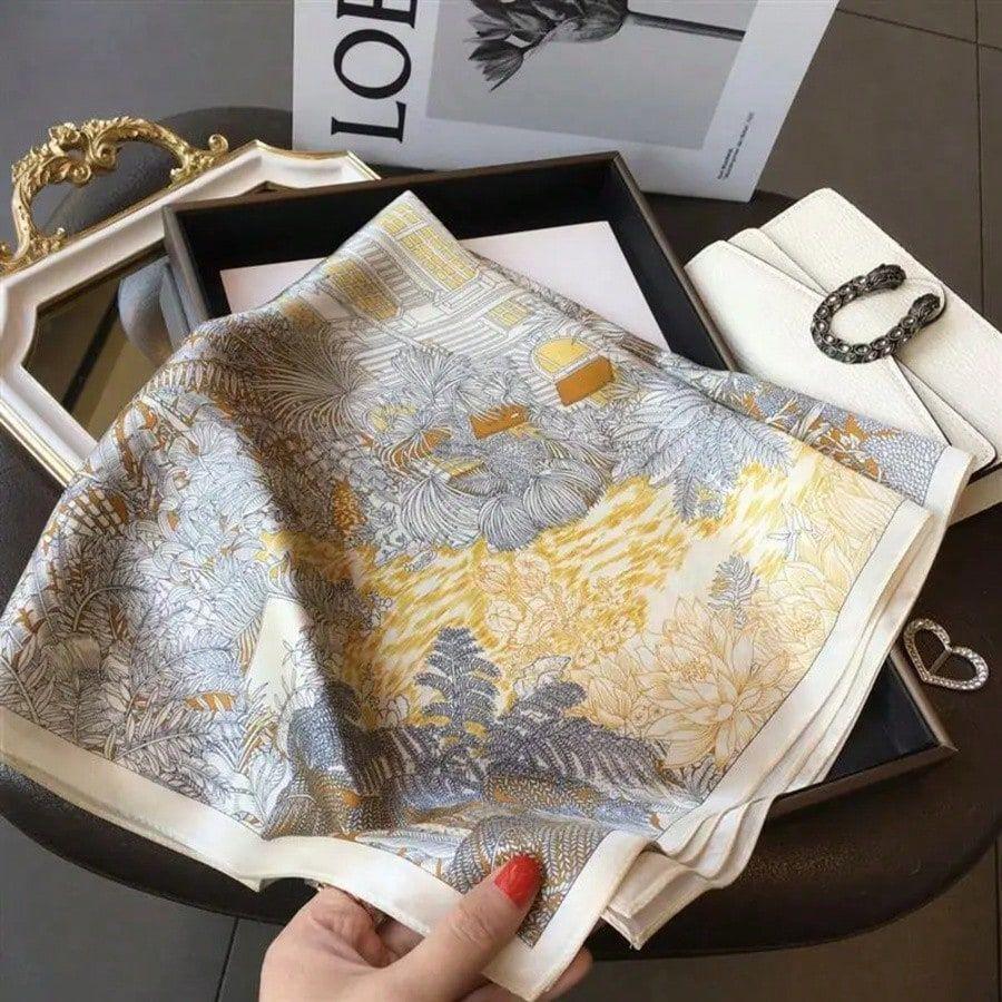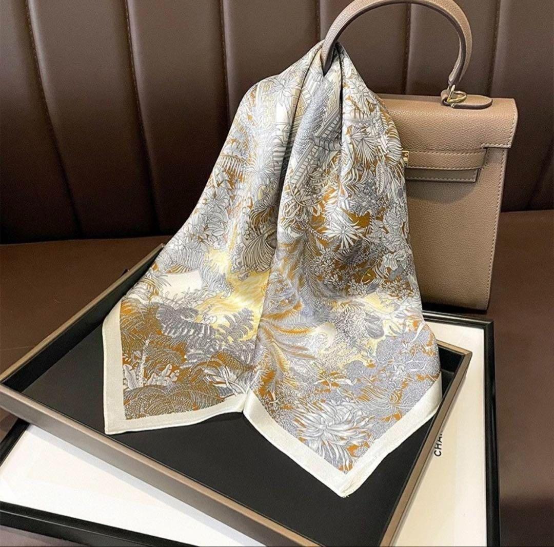 シルクのようななめらかな質感と、ゴールド×シルバーの高級感あふれる配色が魅力のスカーフです。