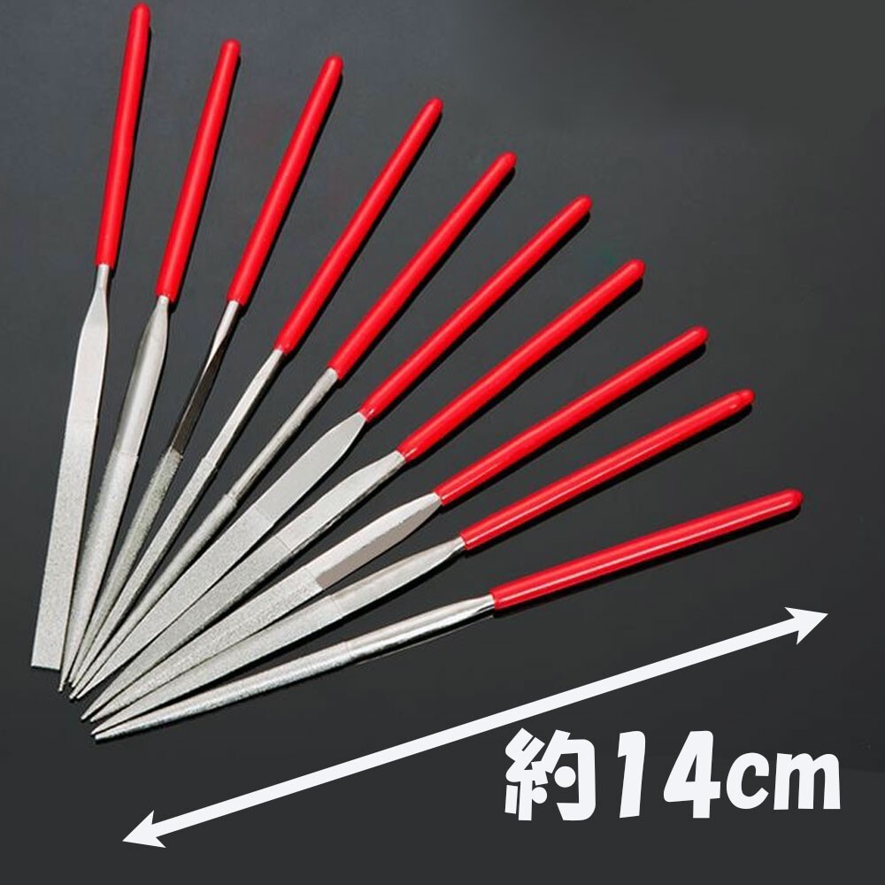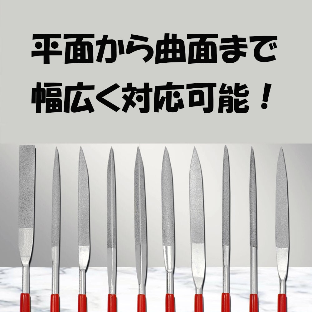 ダイヤモンドヤスリ10本セット 木工用 鉄工用 金属用 プラスチック用 セラミック用 ガラス用など あらゆる加工に対応できるシャープナー 何を揃えたらいいか分からない方 棒やすりセットをお探しの方 初心者の方にもオススメなDIY工具です 平・半丸・丸・三角・楕円形状で 手のひらサイズ 細かい作業に適しています 作業用途 研磨、研削 バリ取り ケバ取り サビ取り 面取り ハンドメイド DIY プラモデルに |