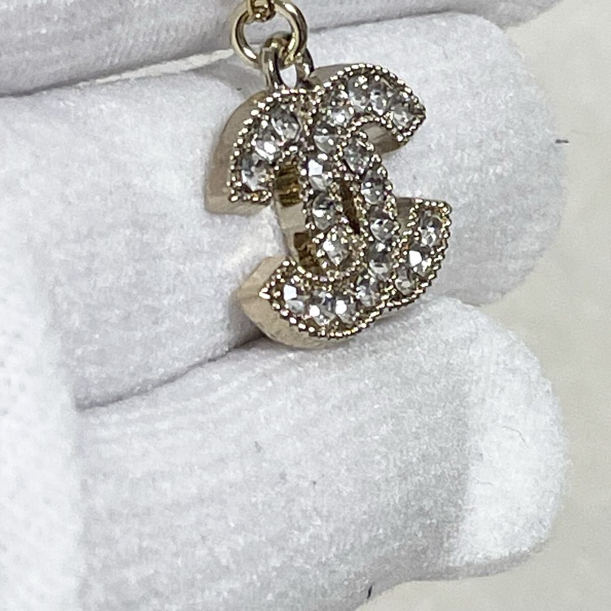 ヴィンテージのシャネルボタンをアクセサリーとしてリメイクした一点物になります。ボタン本来のデザインに、キラキラと輝く**クリアストーン(ラインストーン)**が敷き詰められており、とても華やかでエレガントな印象です。