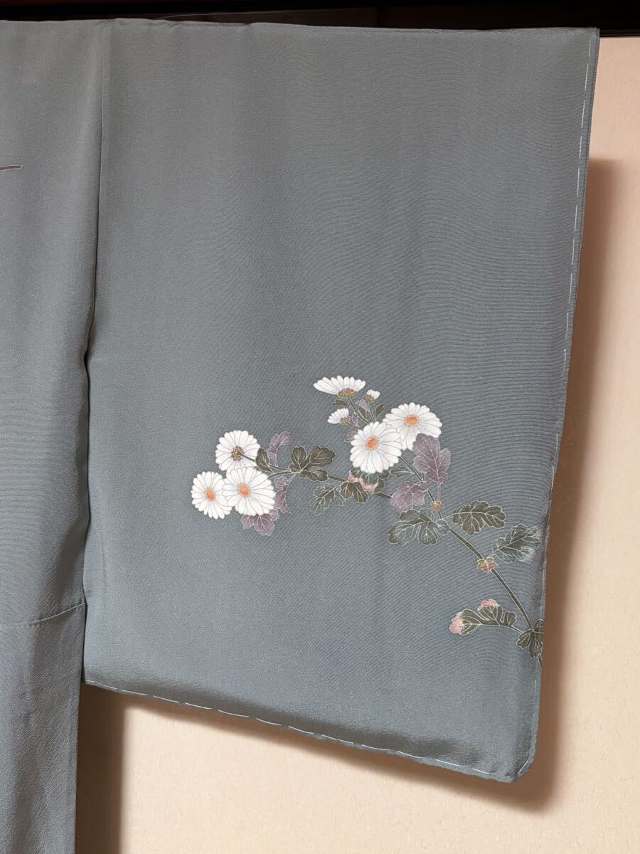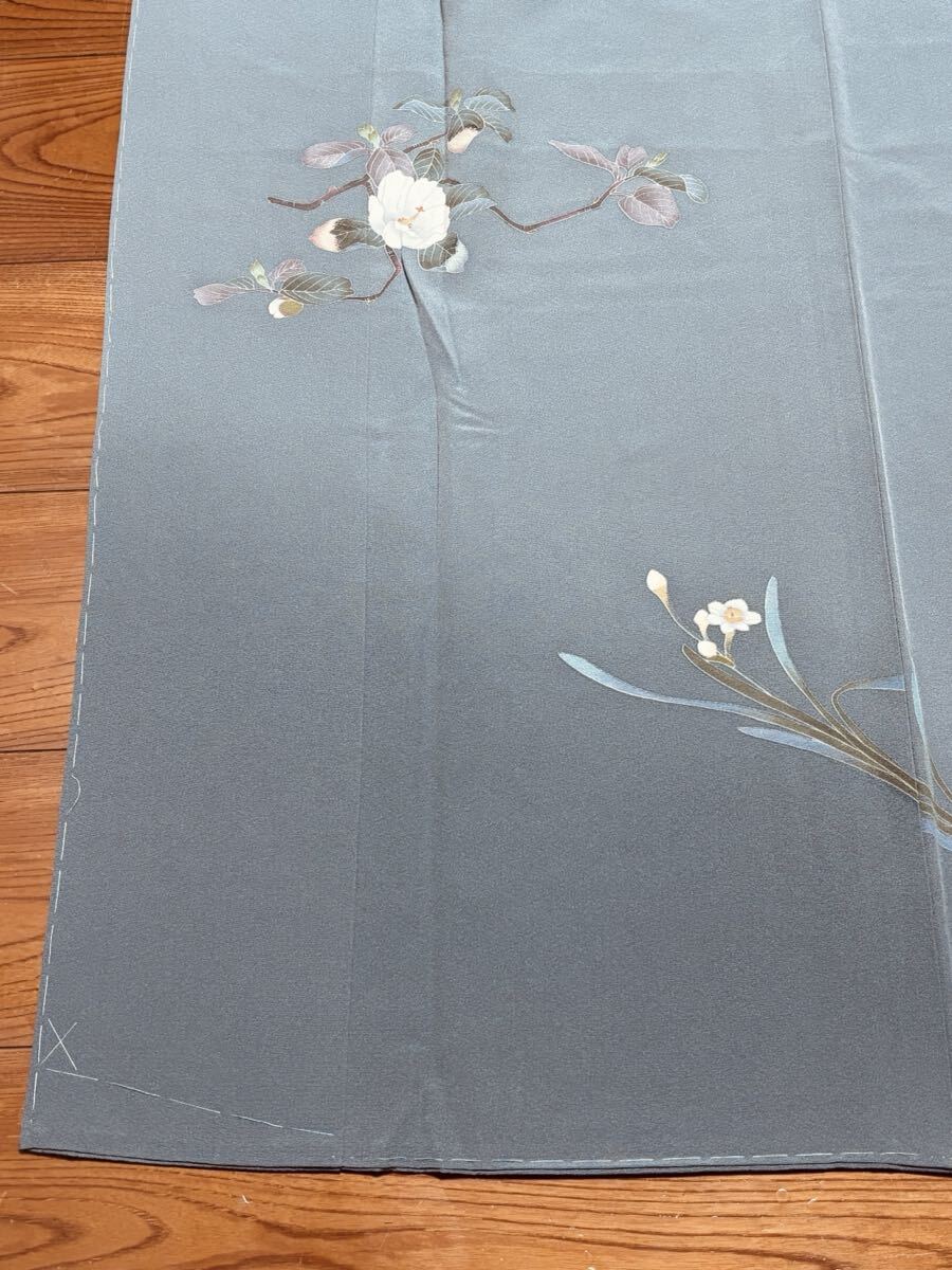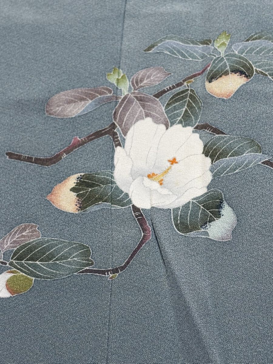 ブルーグレー地に花柄のデザインが映える訪問着。上質でクオリティの高い染めの美しさが魅力です。