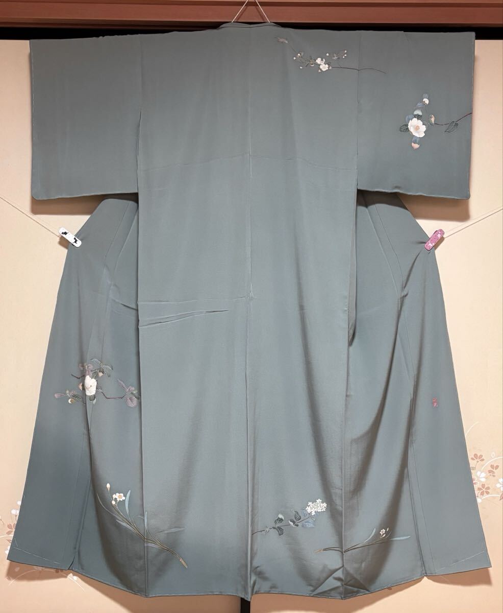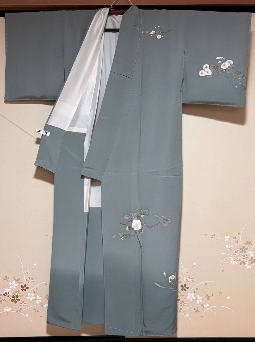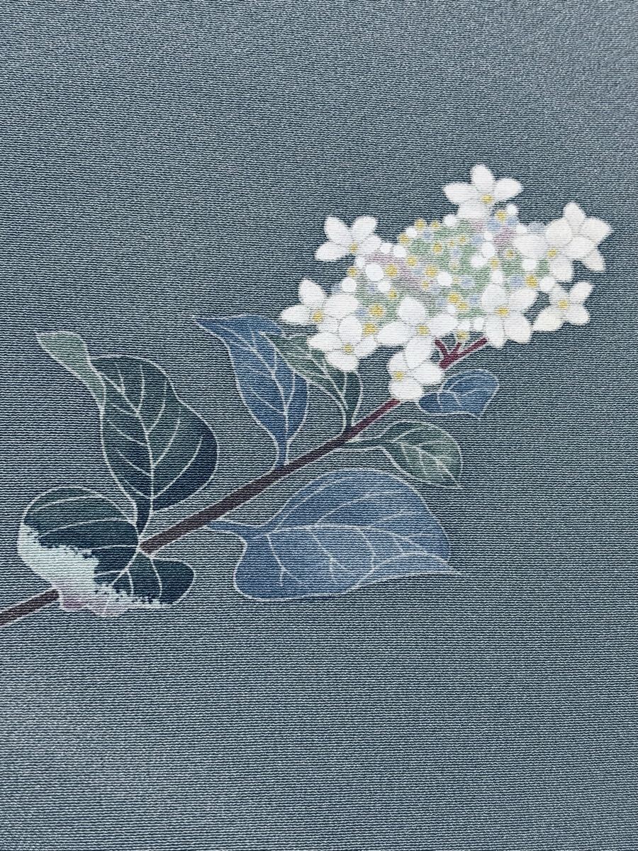 ブルーグレー地に花柄のデザインが映える訪問着。上質でクオリティの高い染めの美しさが魅力です。