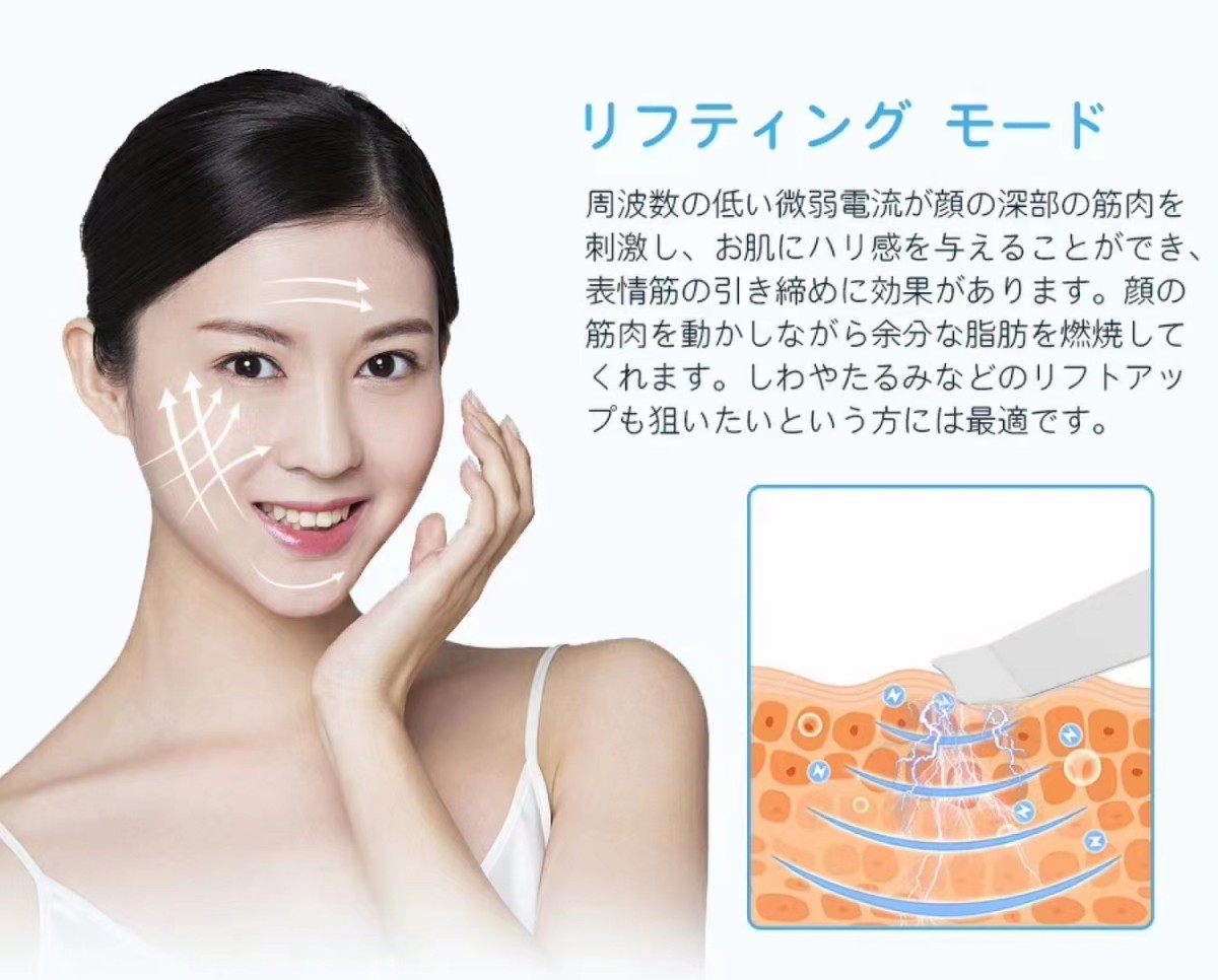 【リフティングモード&お肌の引き締めに】超音波とマイクロカレント(微弱電流)でお肌を整えます。リズミカルなタッピングで肌を心地よく刺激し、お肌の引き締めに最適です。微弱な電流を流すことでお肌を活性化させ、ツヤとハリのあるお肌に導きます。また、血行促進にもなって、肌代謝が上がることで、美肌を作り出す効果を期待できます。