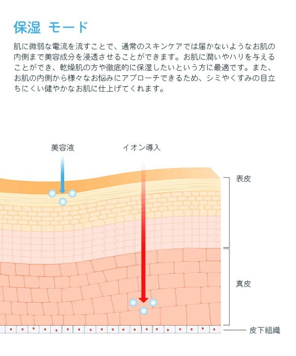 【保湿モード&美容成分が浸透】クリアになった毛穴に超音波振動とマイナスイオンの力で、美容液の有効成分をお肌の奥深くまで届けます。通常の手によるパッティングでは届かない部分まで浸透。いつもの美容液の効果が格段にアップします。透明感溢れるみずみずしい肌へと導きます。