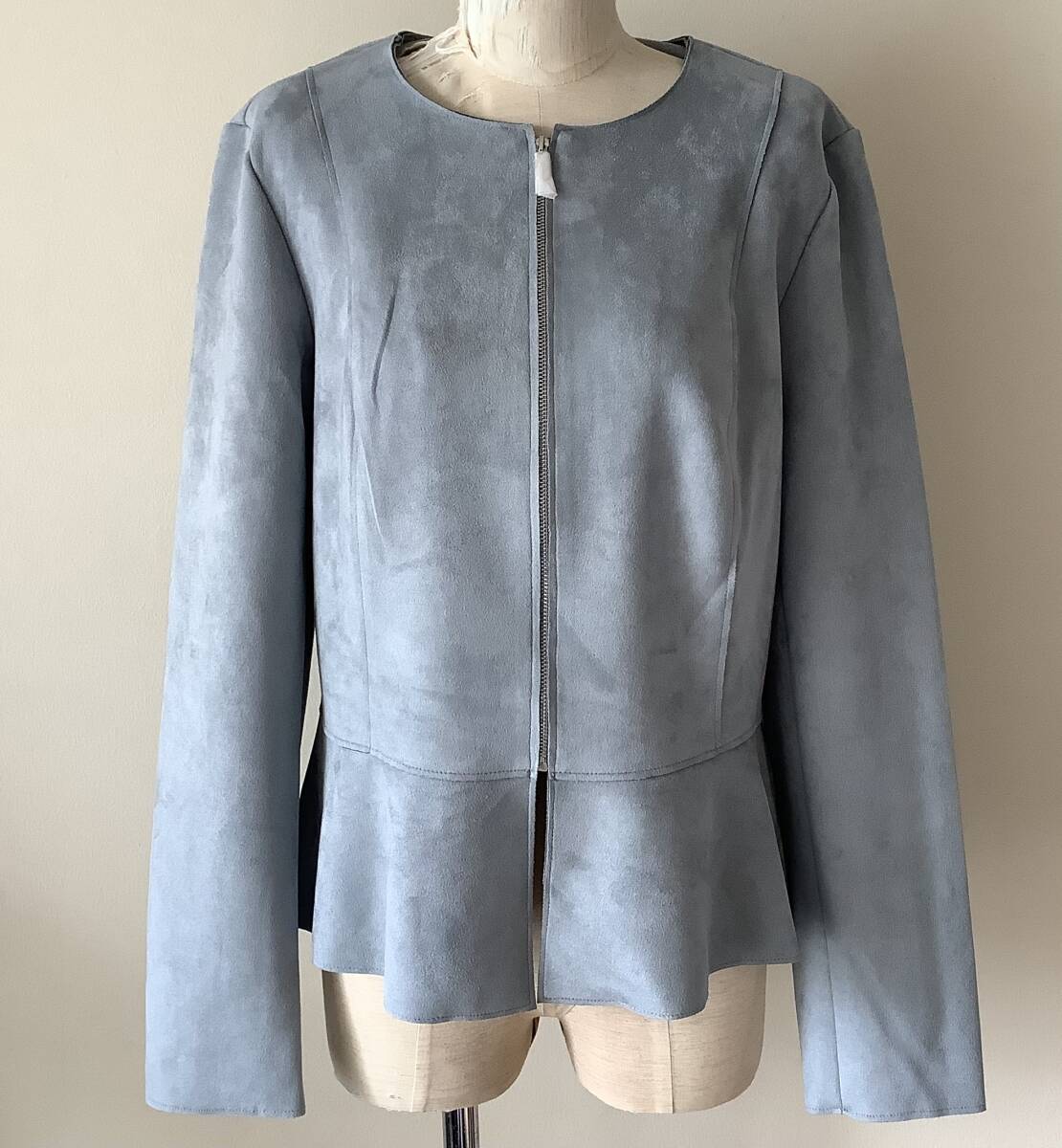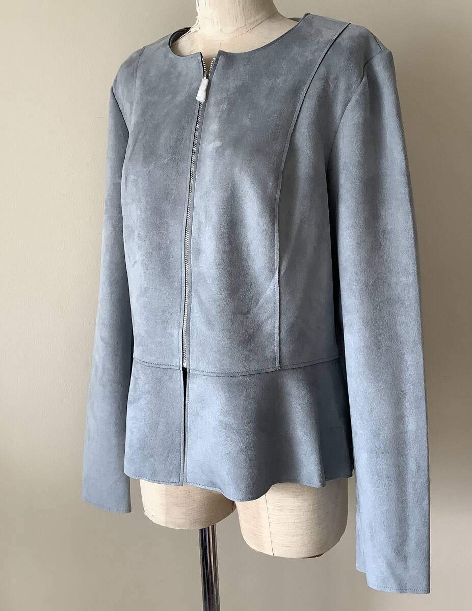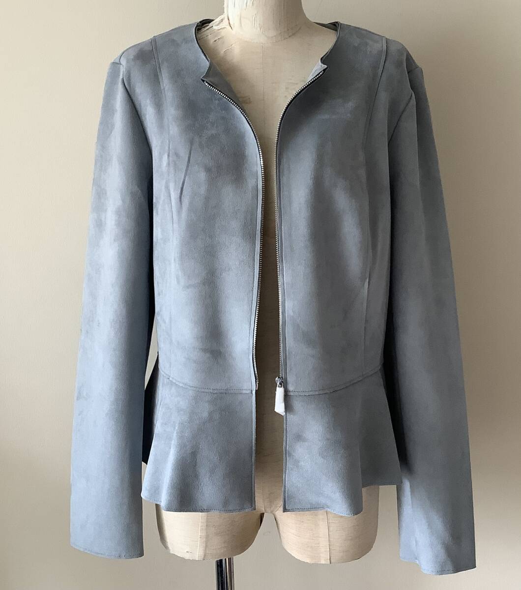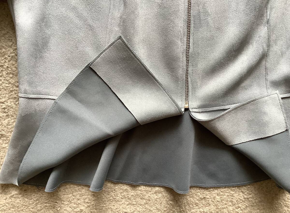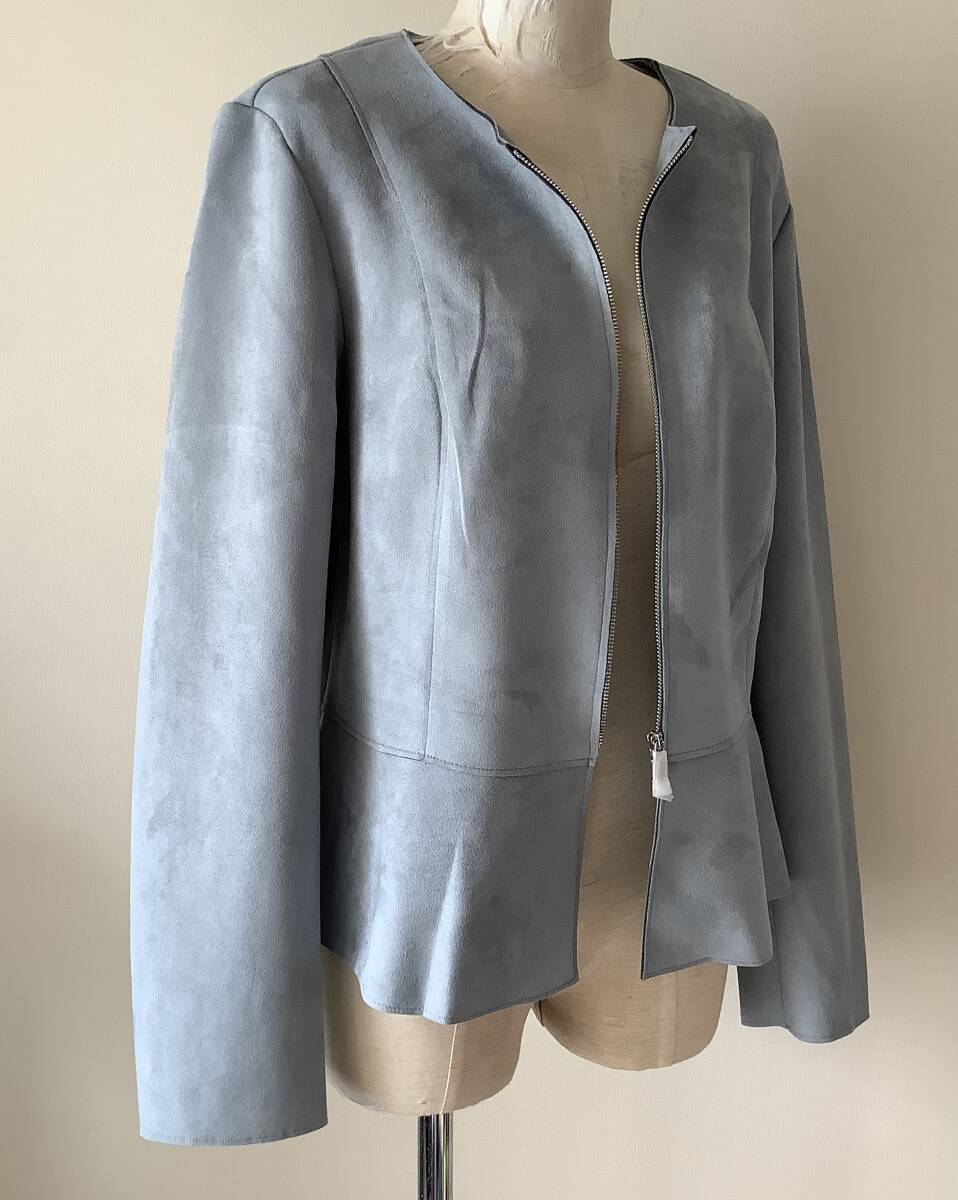 ノーカラー、フロントシルバージッパー、裾はペプラムのデザインです。