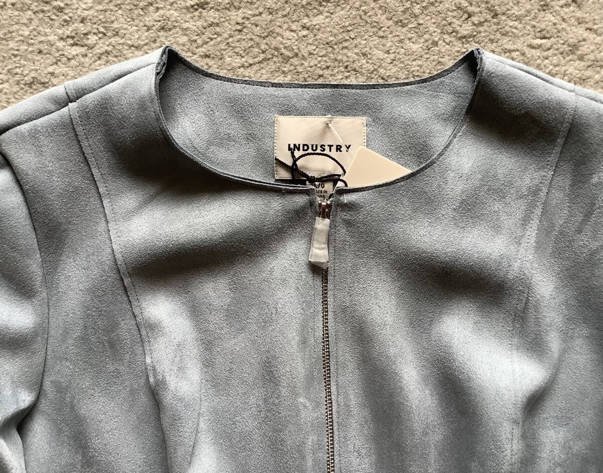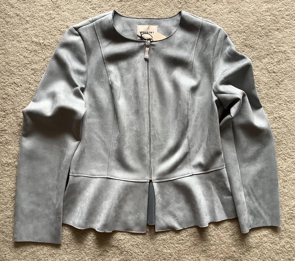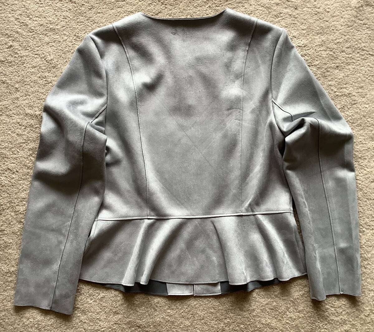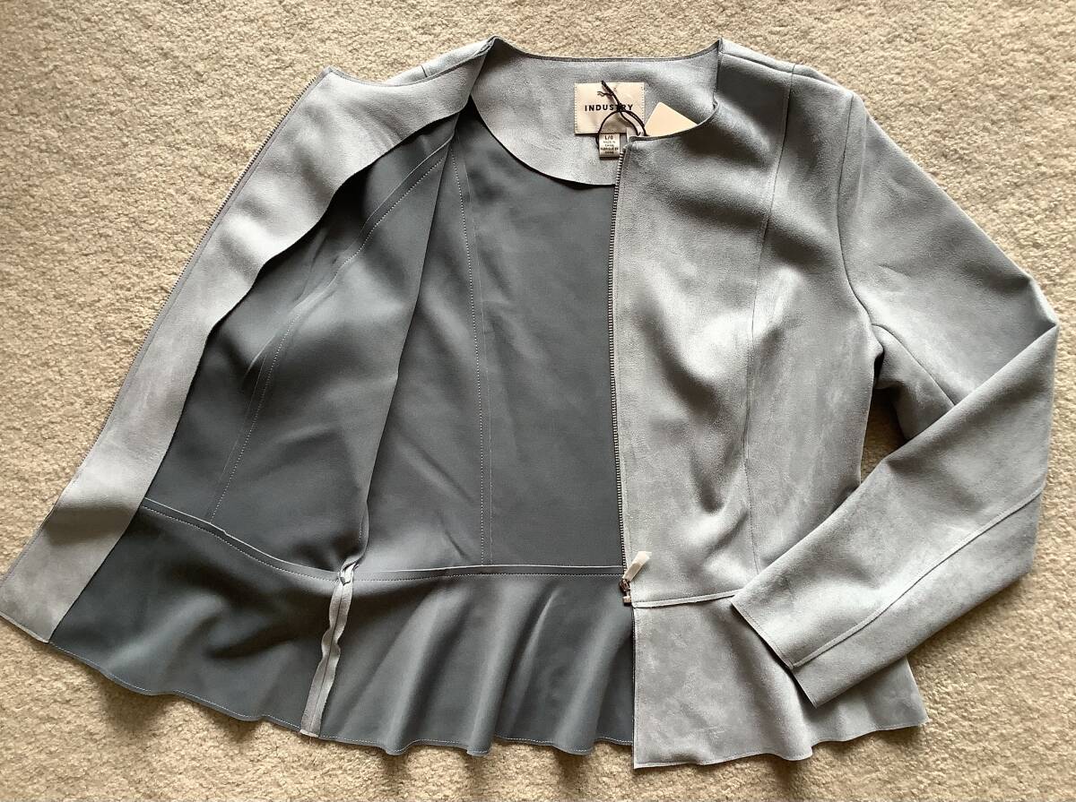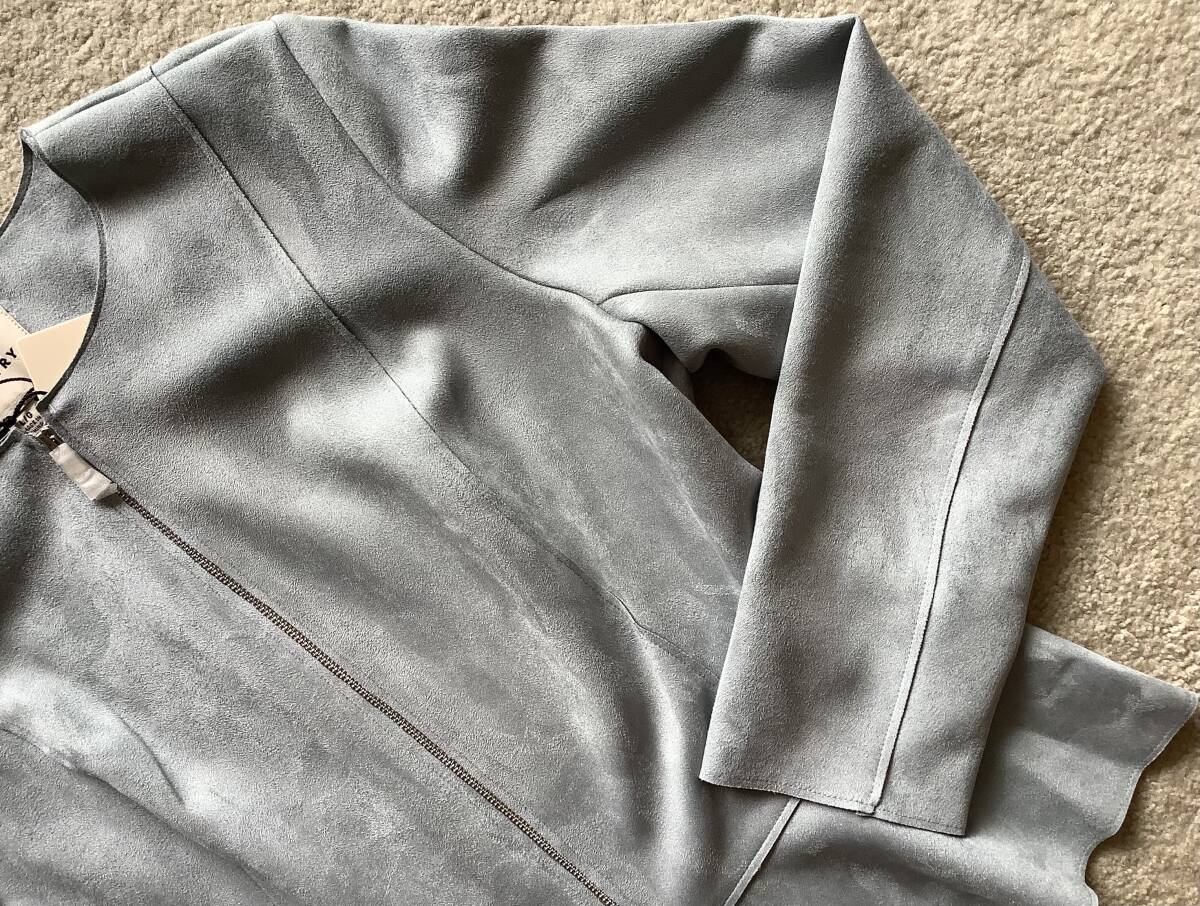 ノーカラー、フロントシルバージッパー、裾はペプラムのデザインです。