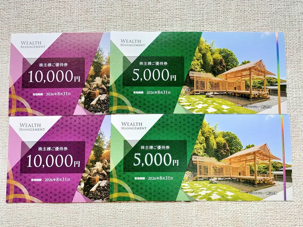 ウェルスマネジメントの株主優待券 3万円分(1万円×2枚、5千円×2枚)です。