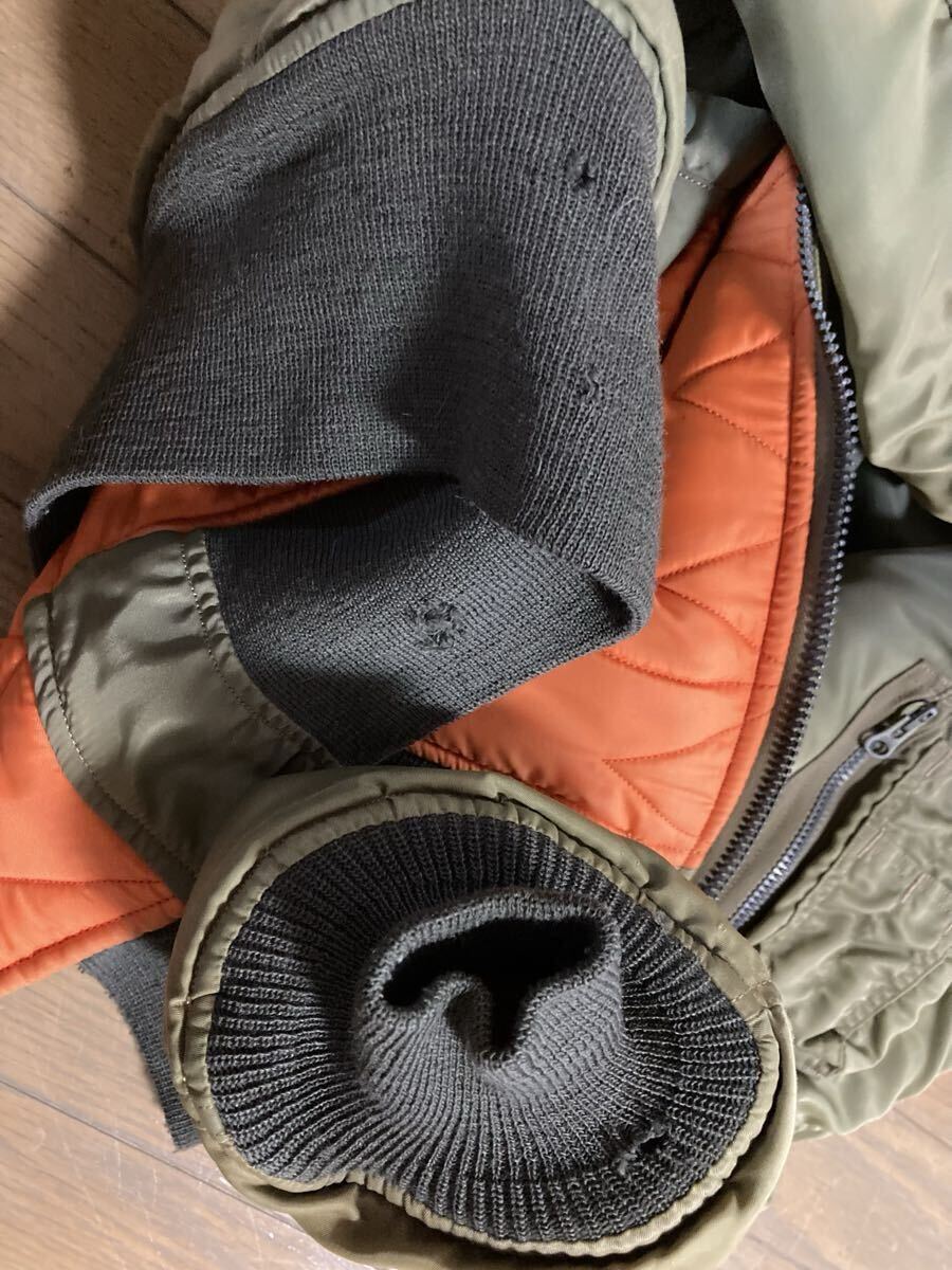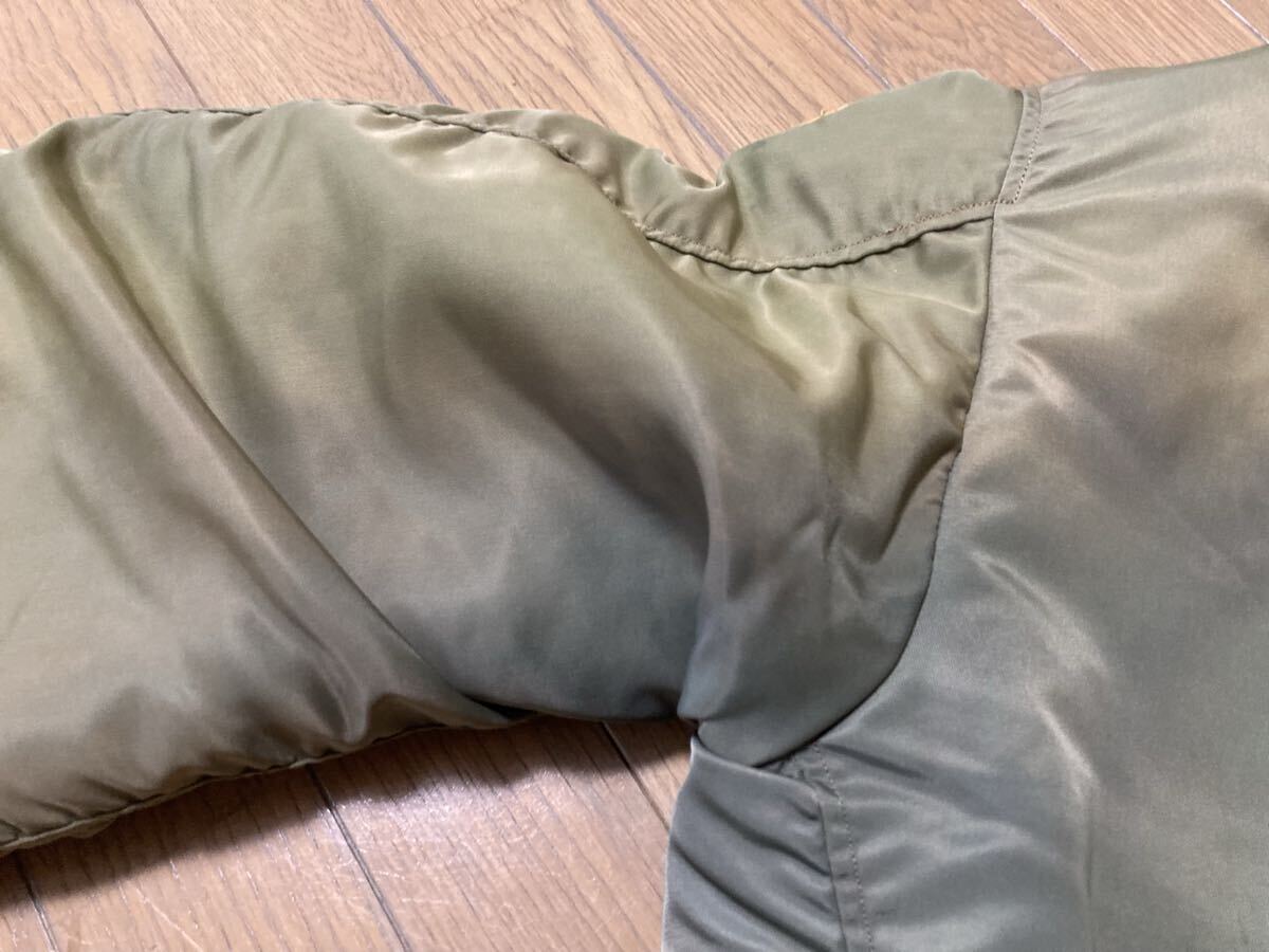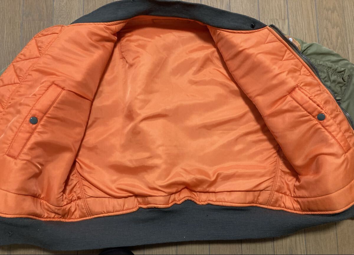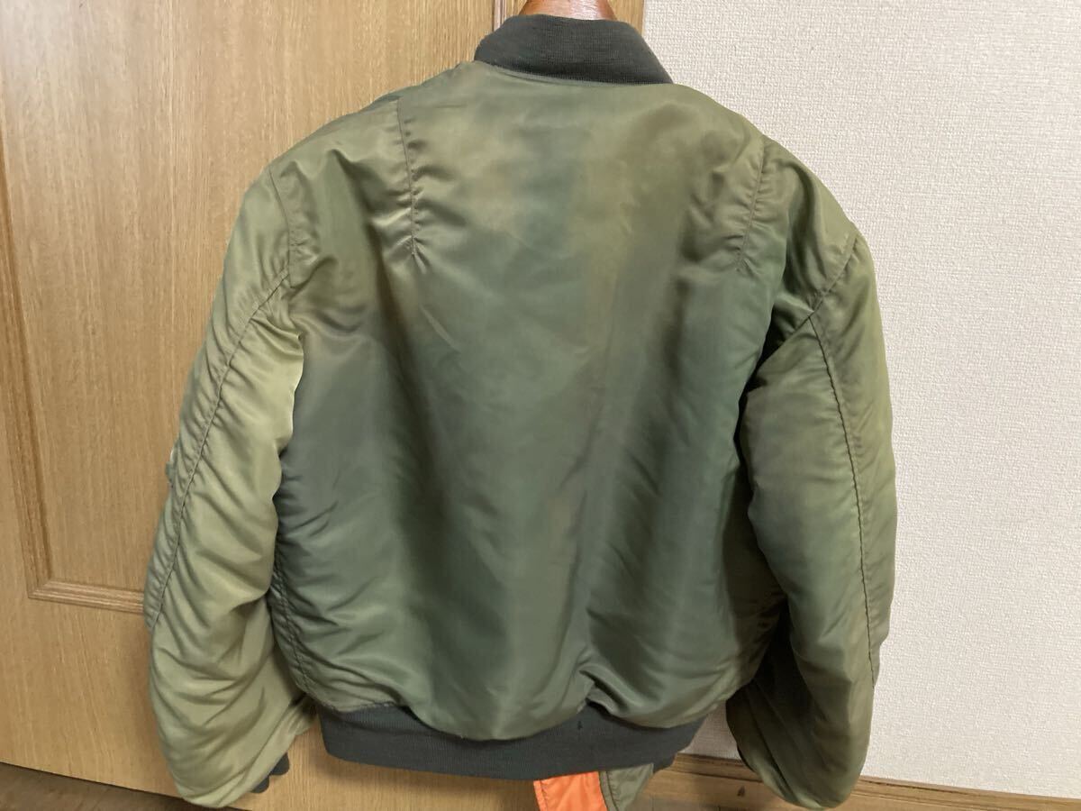フライトジャケットMA -1のオリーブグリーン褪色モデルです。玉虫色に綺麗に色やけしているのが気に入っています。