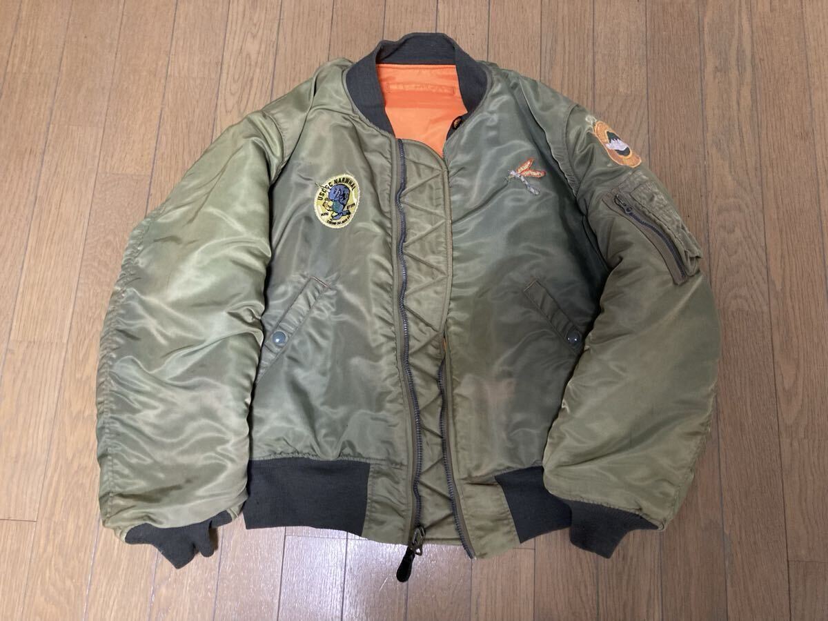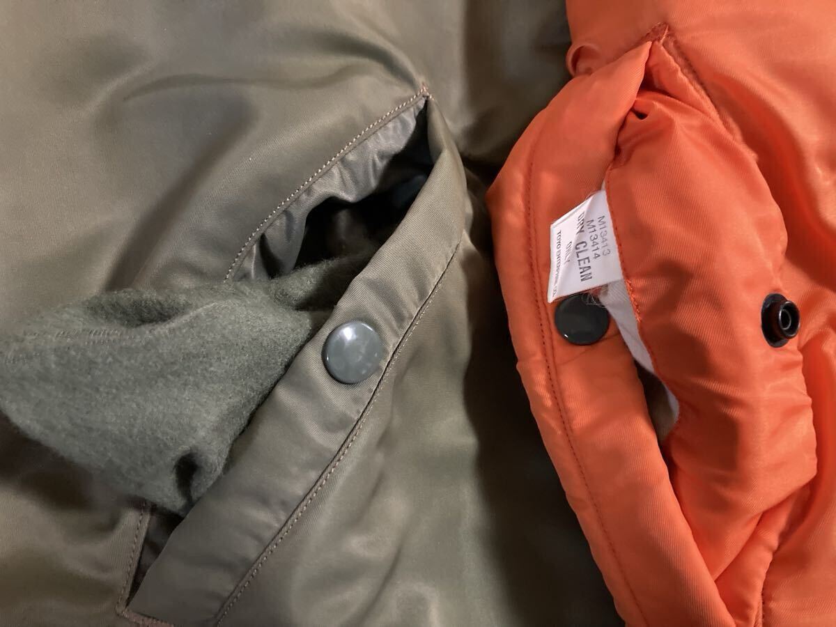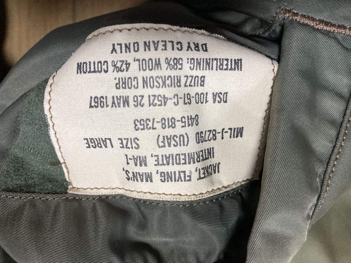 フライトジャケットMA -1のオリーブグリーン褪色モデルです。玉虫色に綺麗に色やけしているのが気に入っています。