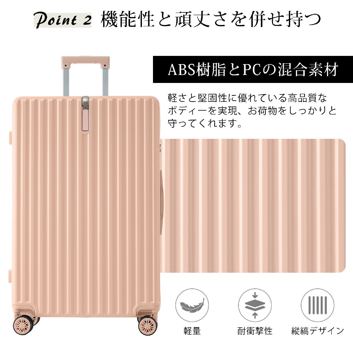 【軽量耐衝撃性に優れた美しいデザイン】スーツケースのボディはPC素材とABS樹脂での混合素材で作られ、耐衝撃性に優れています。デザインもシンプルでおしゃれ!男性だけなく女性の簡単に持ち上げるの軽量なスーツケースです。超軽量で、長距離旅行中に耐久性を提供し、旅行者の負担を軽減します。女性でも楽々に持ち出かける人気なスーツケースです。