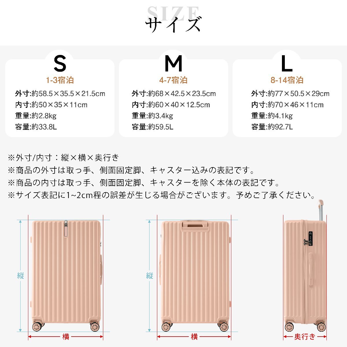 【商品仕様】※S size:外寸:約35.5×21×58.5cm 内寸:約35×11×50cm 本体重量:約2.8KG 、1~3泊に似合い。※M size:外寸:約42.5×23.5×68cm 内寸:約40×12.5×60cm 本体重量:約3.4KG、4~7泊に似合い 。※L size:外寸:約50.5×29×77cm 内寸:約46×11×70cm 本体重量:約4.1KG 7泊以上。