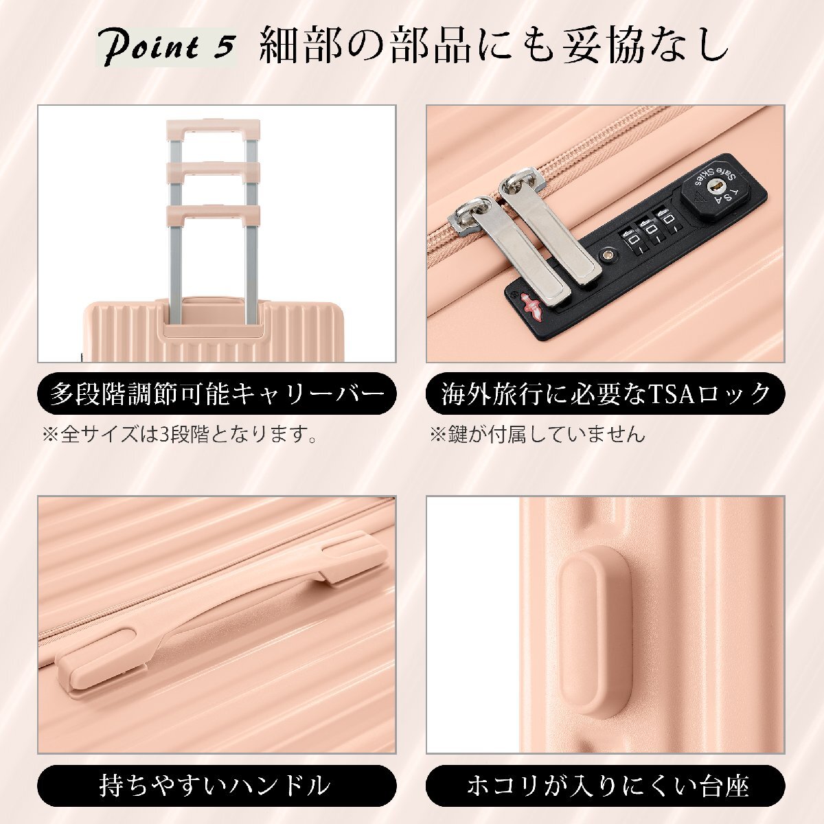 【TSAロック・多段階キャリーバー】スーツケースは海外旅行には欠かせない世界基準のダイヤル方式のTSAロックを採用しています、国内外にも関わらず、航空便をご利用する際に便利で、より安全です。それに暗証番号式だから使いやすい。※TSAロックの鍵は税関検査のスタッフが持つマスターキーですので、付属しておりません。高さ3段階調節、スーツケースは身長や状況に応じて自由に長さを調節でき、持ち運びもラクラクです。