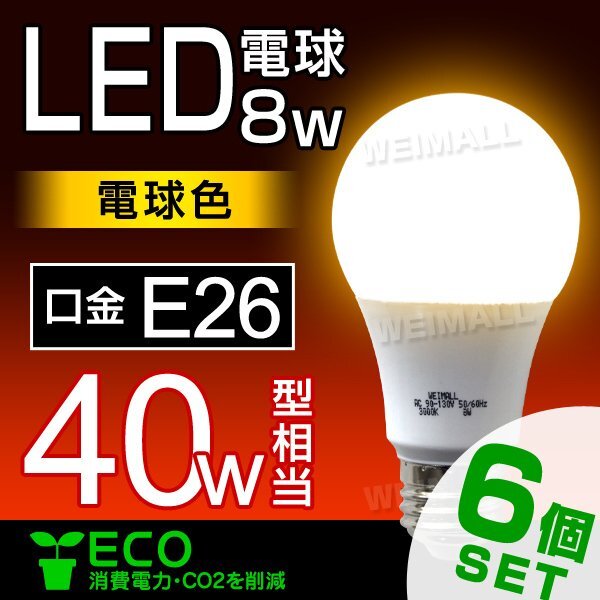| 6個セット LED電球 E26 40W形 8W 電球色 電球 LEDライト LED電球 e26 LED 電球 照明 照明器具 led電球 ledランプ ledライト 保証付き |