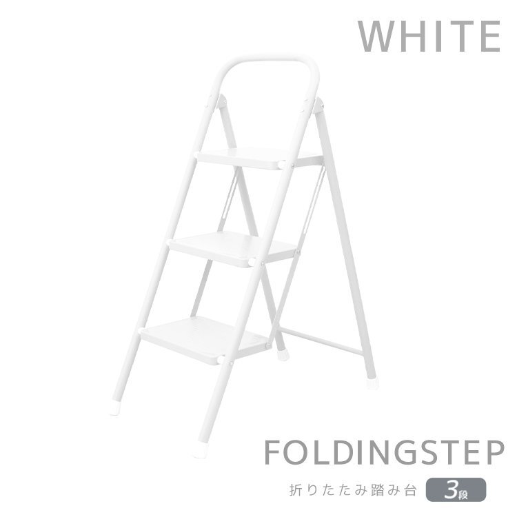 ステップ台 3段脚立 (折りたたみステップ 滑り止め加工) 耐荷重(約): 150kg 段数: 3段タイプ カラー: ホワイト 暮らしに馴染むやさしいカラーの折りたたみステップです。 一家に一台あると便利! 照明器具の交換や、高い位置になる棚から物を取り出すときに便利!! 耐荷重(約)150kg&ワイドステップ!安定感抜群で安心♪ また、滑り止め加工・握りやすい持ち手・脚先グリップで最上段まで簡単に上れます! お部屋や玄関に置いても邪魔にならないスリムサイズ。 折りたためばコンパクトに!手軽に持ち運びできちゃいます☆ |