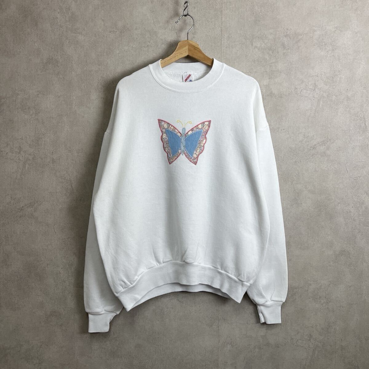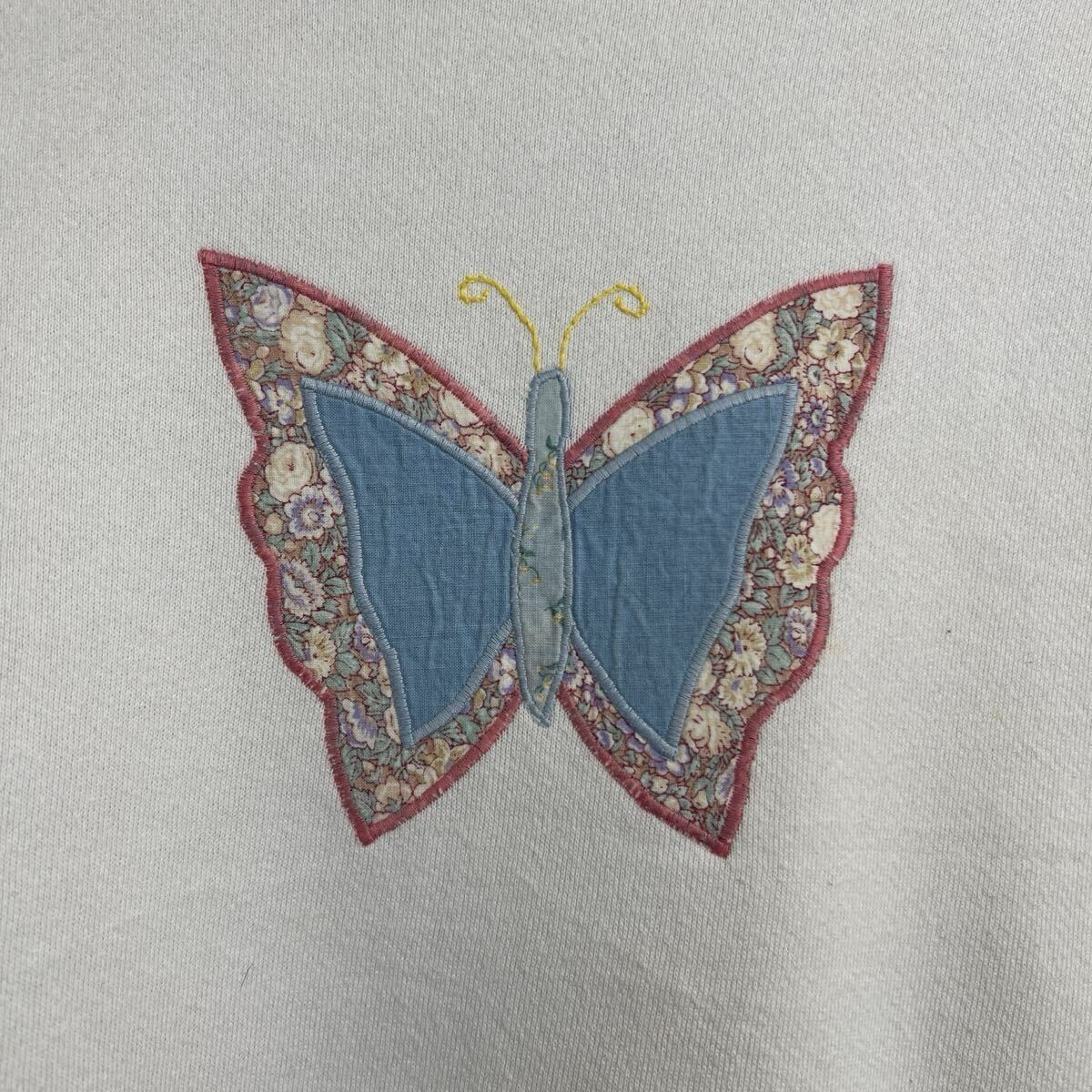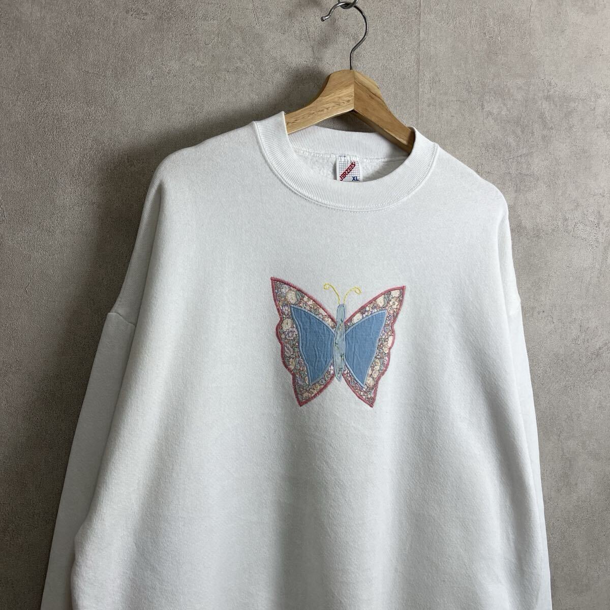 白ボディにレトロな蝶々の刺繍アップリケデザイン。