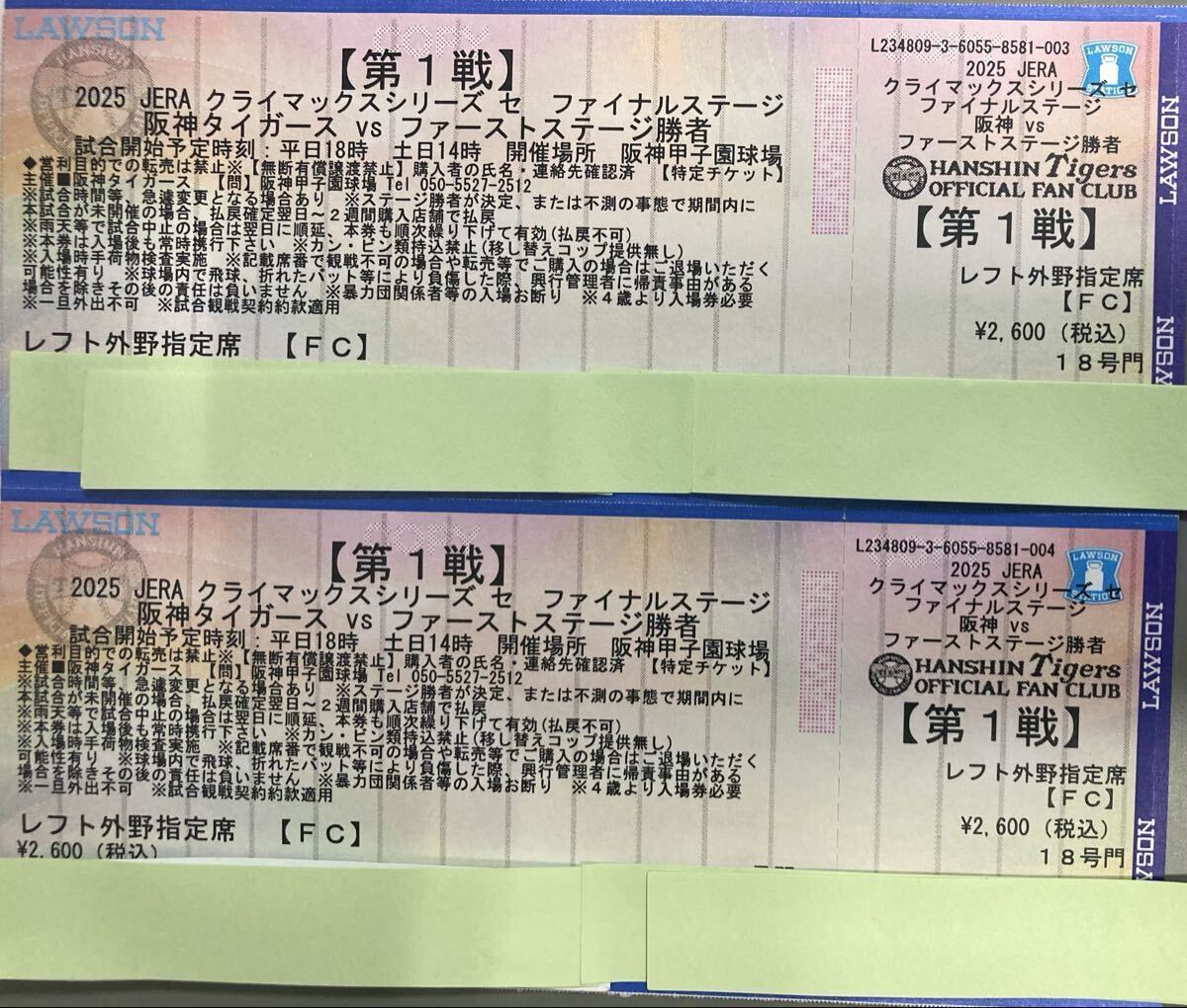 10月15日(水)レフト外野席 甲子園球場 クライマックスシリーズ ファイナルステージ 第1戦 阪神タイガース 2連番