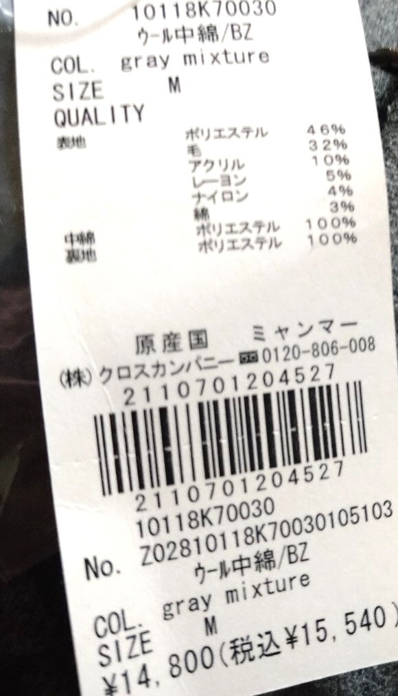 未使用☆タグ付き☆earth music&ecology☆ウール中綿ブルゾン☆アースミュージック&エコロジー☆М☆定価15540円