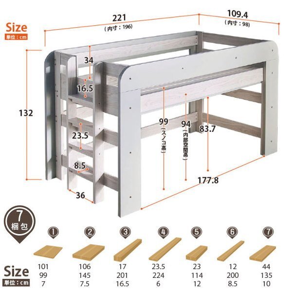 | 全体サイズ(cm) | ■本体外寸 幅109.4cm×長さ221cm×高さ132cm ■上段内寸 幅 98cm×長さ196cm ■マットレス付属した場合 Sサイズ 幅 97cm×長さ195cm×高さ9cm |
