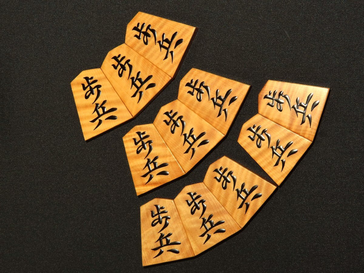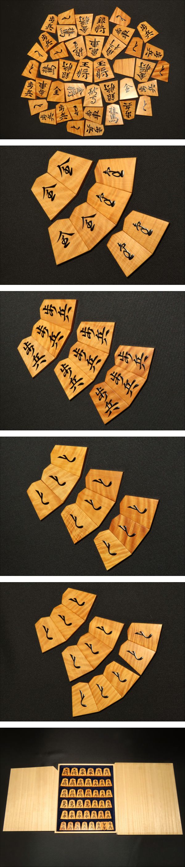 木地は本黄楊虎杢。ご覧の通り非常に味の良い木地です。中国産黄楊です。全ての駒の表裏をUPいたしましたので是非ご覧ください。
