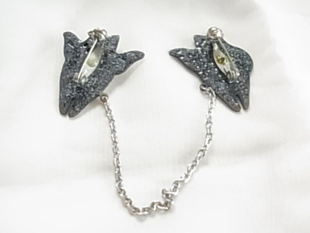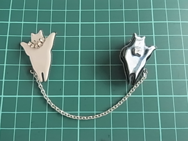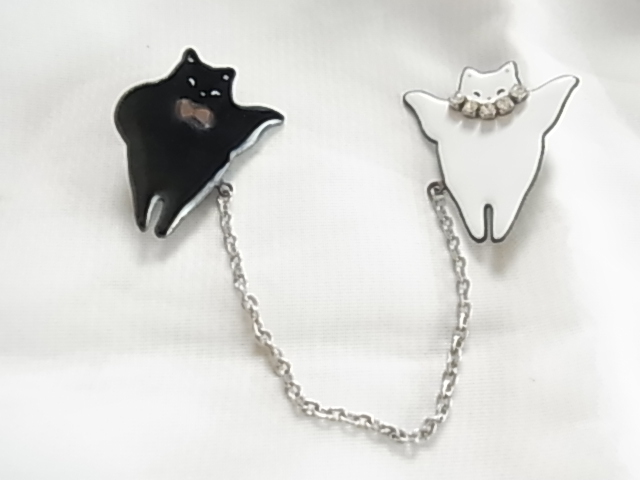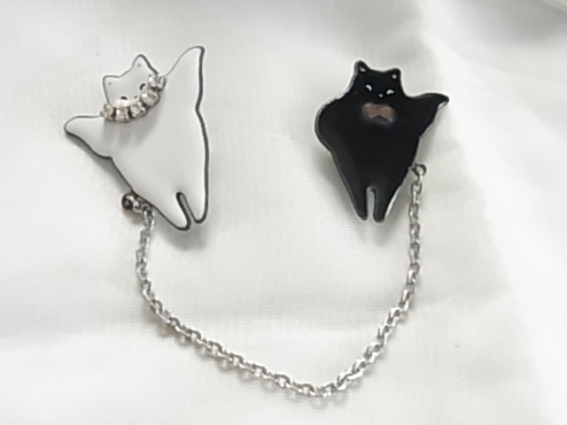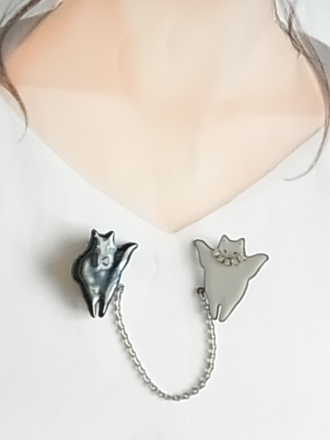 ビンテージ/ヴィンテージ 焼き物系 七宝焼き?クリアラインストーンの首輪をつけている白系と黒系の猫のモチーフ ダブルブローチ※