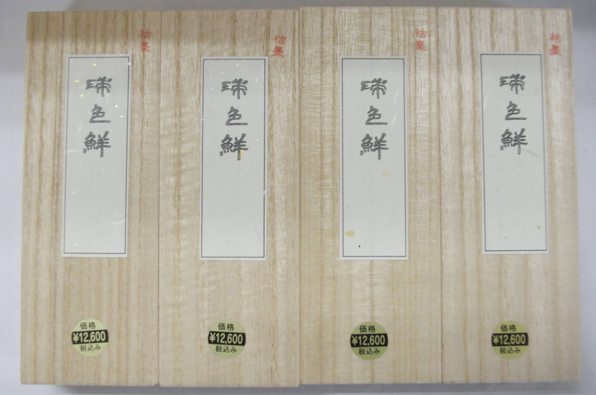 書道用の固型墨 微粒子油煙墨「瑞色鮮」5丁型4本セットで出品いたします。 漢字作品用。裏面に金箔が貼ってあります。 墨磨り機にも対応しております。 鉱物性油煙ながら粒子が細かく、艶のある墨色です。 定価12600円の物です。 全て新品未使用の桐箱入りになります。 サイズ 約134×34×15㎜ 86g 土日は休みの為取引連絡、発送が出来ません。 平日のみの対応になります。