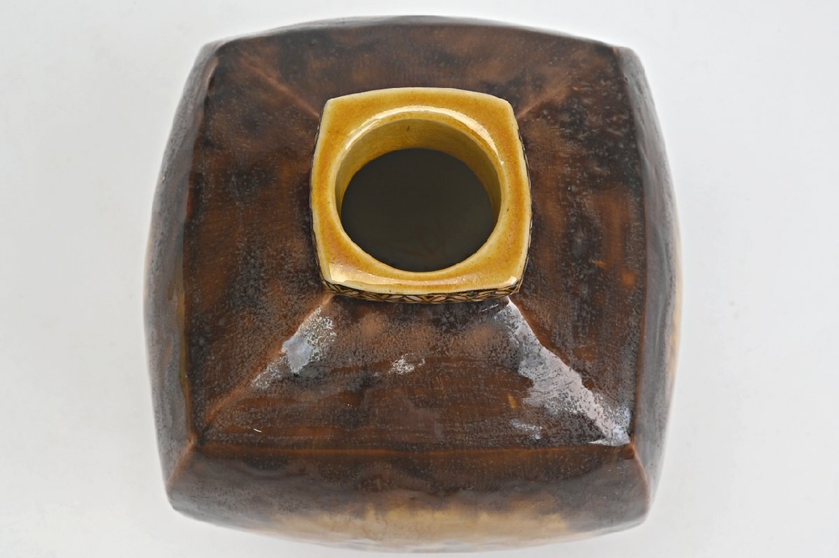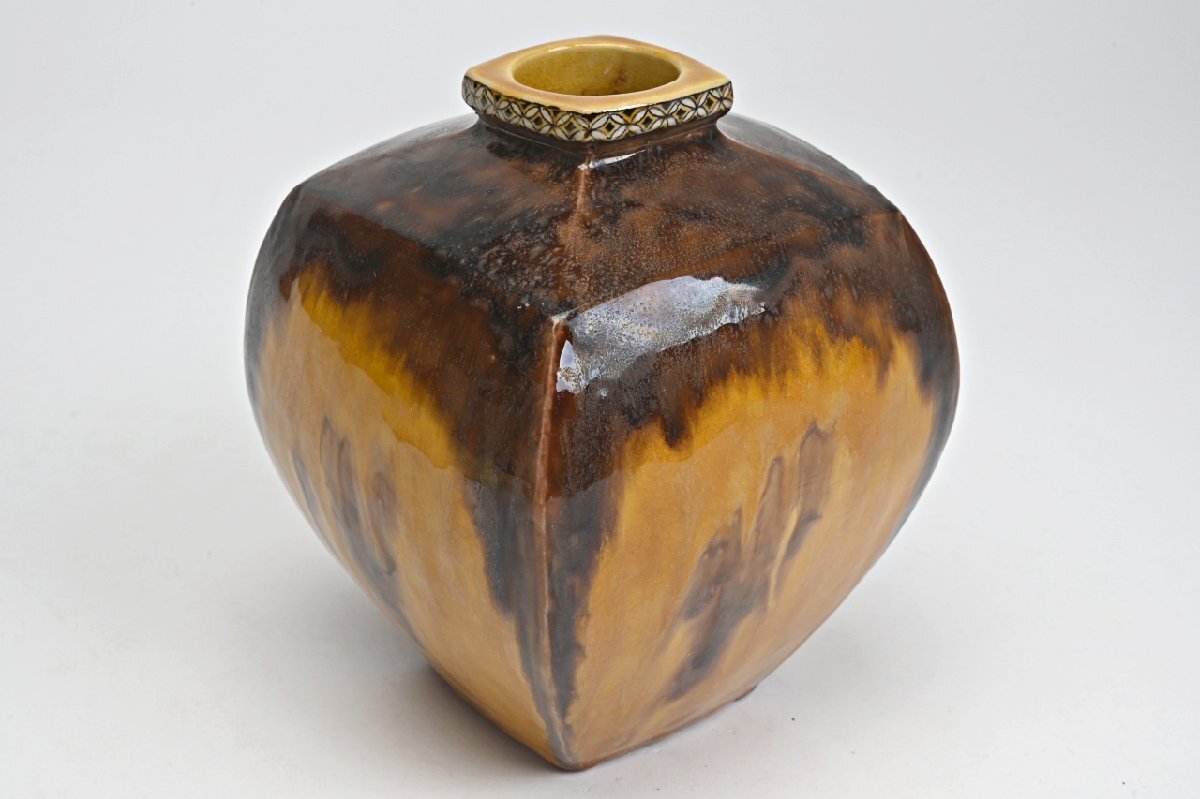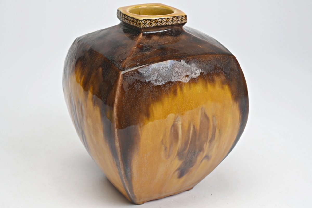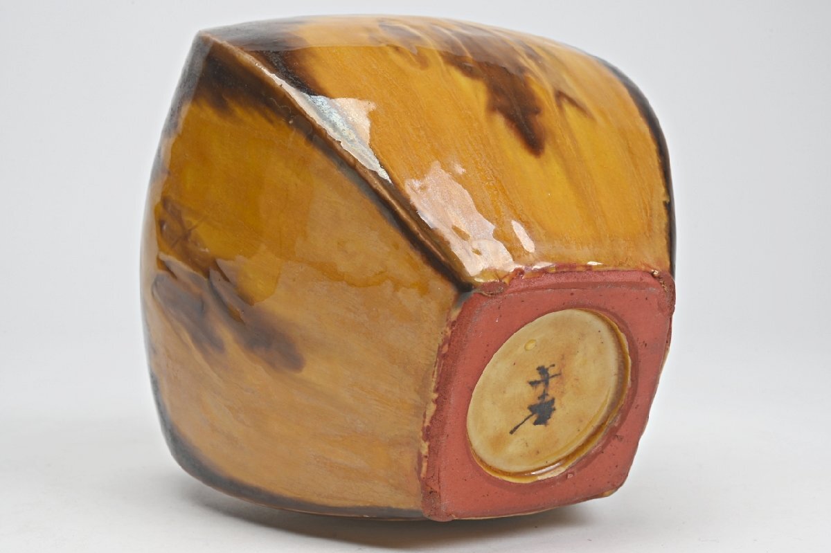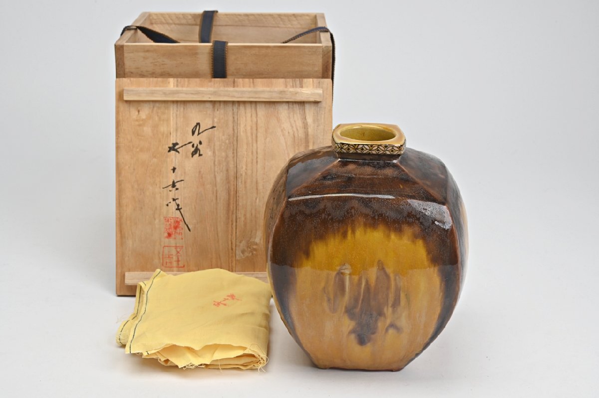 浅倉五十吉 作 七宝紋口黄釉華生 共箱 花瓶 花器 壷 置物