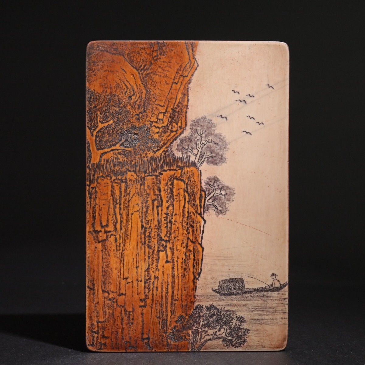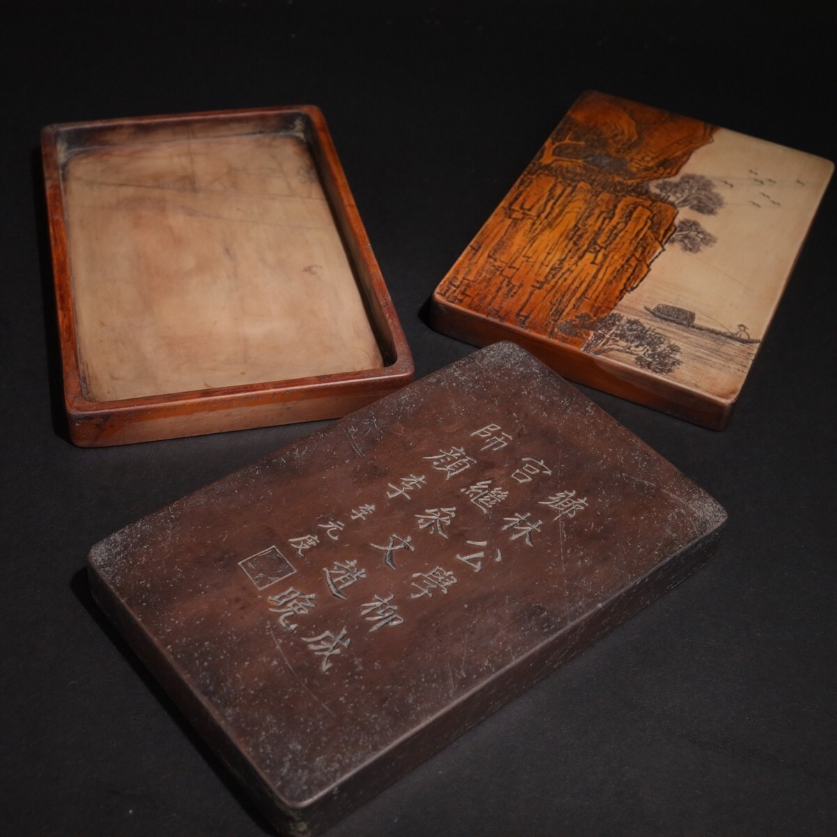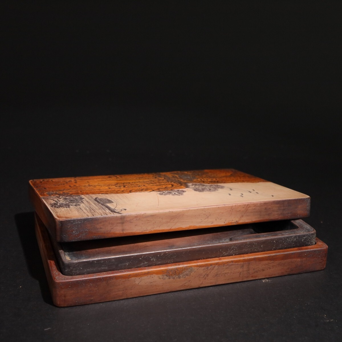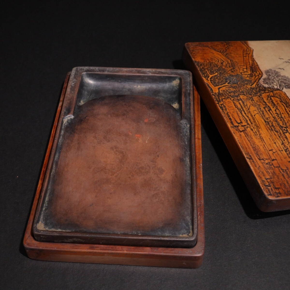 「松花石硯 秋江漁翁文房蓋硯 李元度銘 清時代」手彫り 文房四宝 書道具 中国古美術 旧蔵出