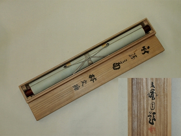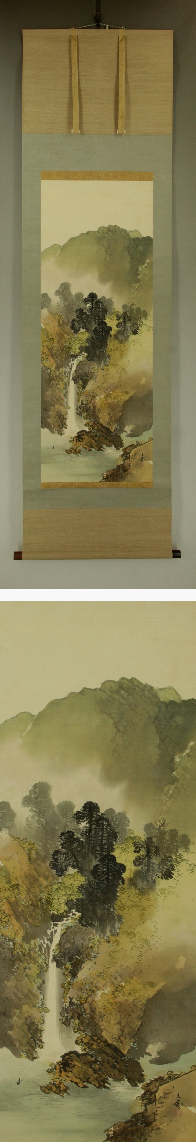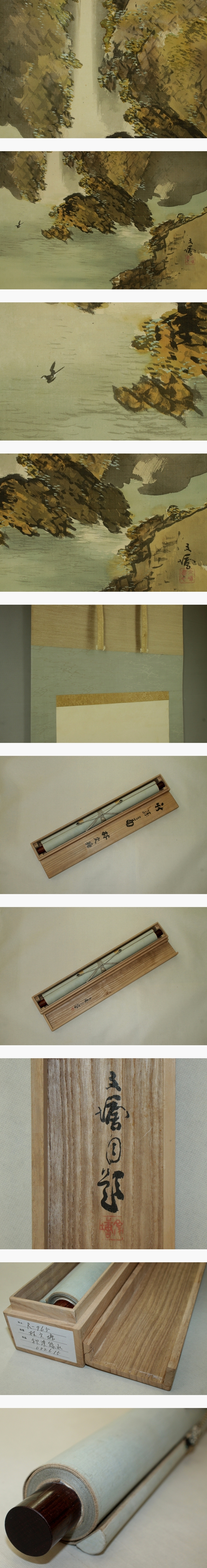 林文塘 はやし-ぶんとう(1882-1966) 日本画家。京都生。名は光三郎。 前川文嶺・山元春挙に学び、山水画を得意とする。 文展入選後、井口華秋・池田桂仙らと反帝展の自由な制作を目指して日本自由画壇を結成した。 昭和41年(1966)歿、84才。 本紙は、染みがあります。 表装は、染み、汚れ、折れ、皺、剥れ、箱に破損があります。 【サイズ】 作品 横約40.5cm×縦約110.5cm 表装 横約54cm×縦約193cm |