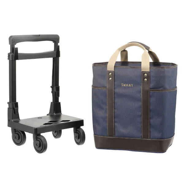 | 内 容 | ■スワニー トートキャリー アクティブタウントート 4輪ストッパー付 ■サイズ M ・本体(フレーム含む):約縦46cm×横30cm×奥行23cm ・バッグ:約縦36cm×横30cm×マチ18cm(容量アップ部含まず) ・ハンドル立ち上がり:約12cm(容量アップ部含まず) ・伸縮式持ち手高さ:約72、77、82、87、92cm ・キャスター:約径7.5cm ・A4サイズ:可 ■重さ ・バッグ、フレーム:約2.5kg ・バッグのみ:約720g ■素材 ・外側:ポリエステル、合成皮革 ・内側:ポリエステル ・フレーム、伸縮式持ち手:ABS樹脂 ・パイプ:アルミニウム ・キャスター:ブタジエン ■付属品 ポーチ ■詳細 ・開口部:ファスナー(ダブル) ・ハンドル:あり(2本) ・メイン室:1室 ・ポケット(外側):オープン3個、スナップ付1個、ダブルファスナー1個 ・ポケット(内側):オープン1個 ・底びょう:0個 ・バッグの背面にフレームの固定用フック入れ4個 ・内側に差し込みパーツ付ベルトあり <フレーム> ・伸縮式持ち手:1本 ・キャスター:4輪 ・背面フック:4個(固定フック、可動式フック各2) ■カラー ブラック ◆参考価格 29150円相当 4輪ストッパー機能搭載モデルで、緩やかな斜面、電車、 バスなどでキャリーが勝手に転がってしまうのを防ぎます。 キャスターは360度回転式で小回りが利き、方向転換もスムーズ。 バッグはデニム調の生地に合成皮革をポイントに使い、 カジュアルな場面だけでなく、ビジネスシーンでもお持ちいただけるデザインです。 多彩なポケットで荷物を効率よく収納でき、 背面側のマチ付ポケットは500mlのペットボトルが2本入るたっぷり容量。 側面のオープンポケットはファスナーで拡張できます。 フレームからバッグが取り外しやすい背面フック仕様なので、 外出から戻られたらフレームは玄関に置き、バッグだけ室内に持ち込めます。 |