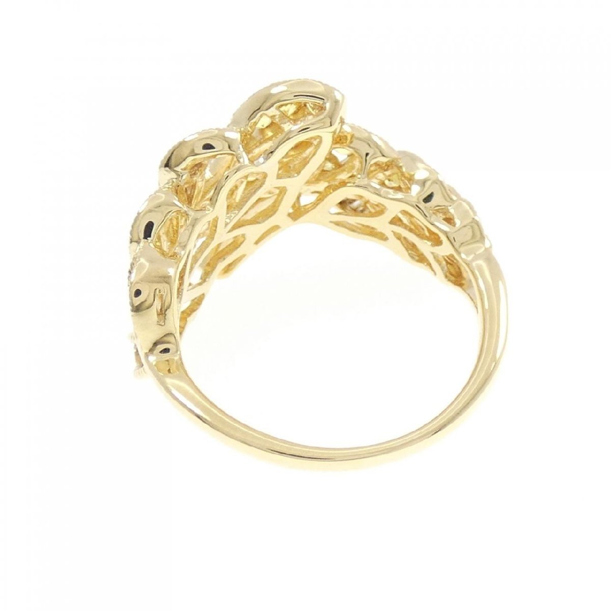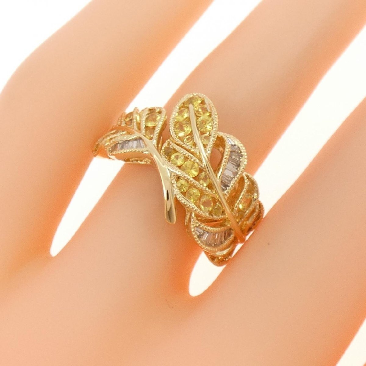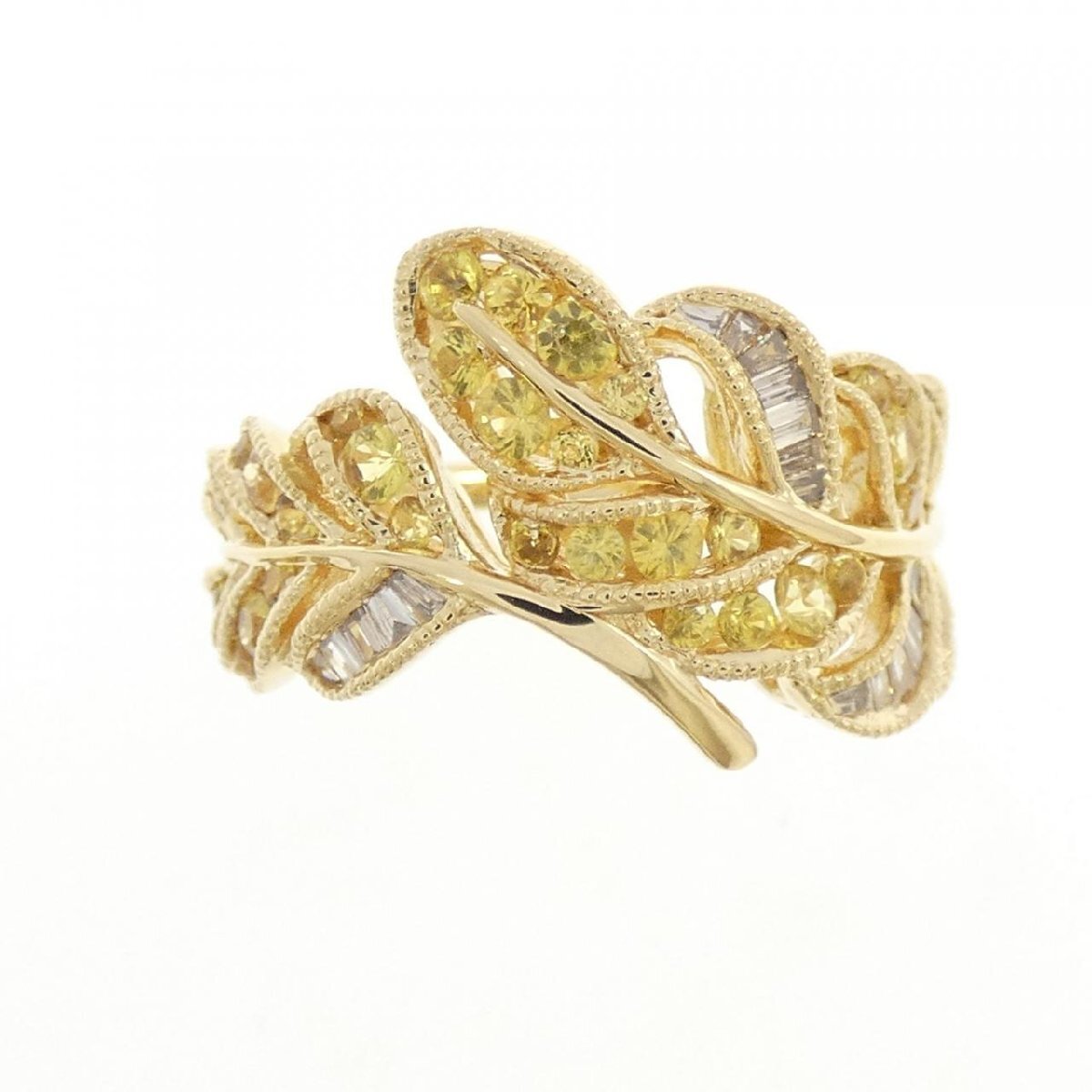 イエローカラーのサファイヤと煌くダイヤモンドがあしらわれた葉っぱモチーフのリング。指元を明るく飾ります。