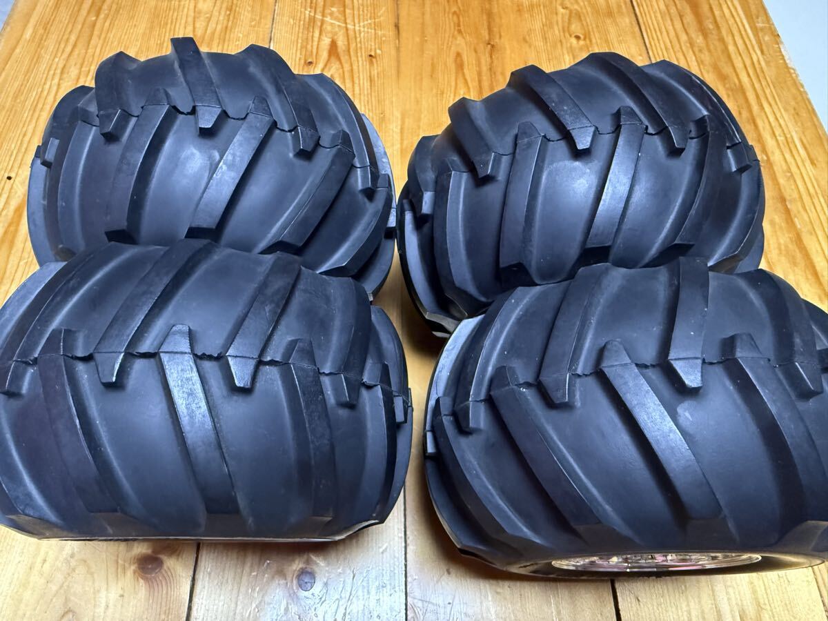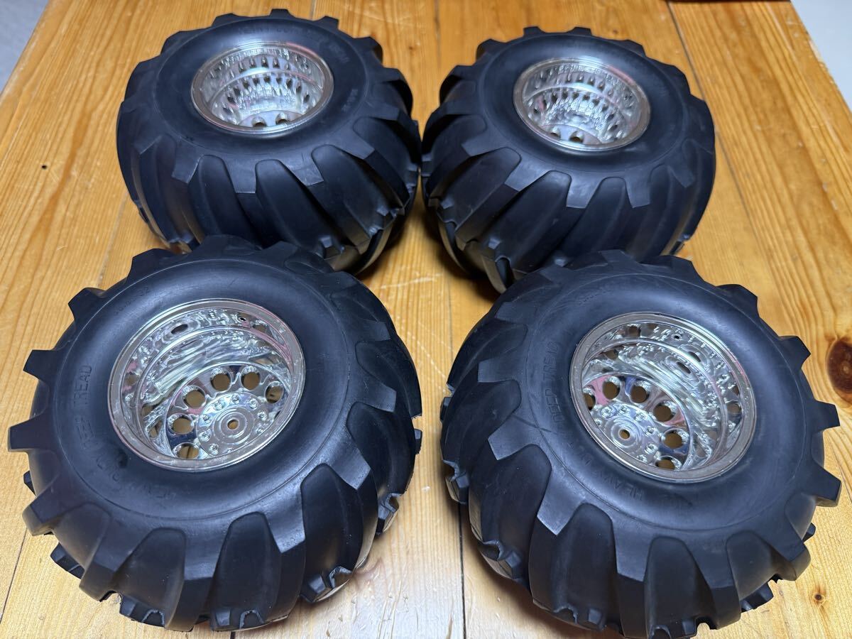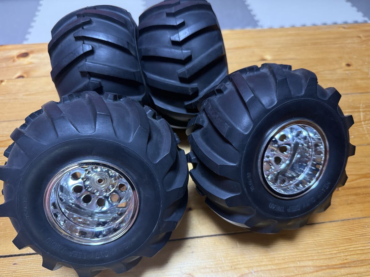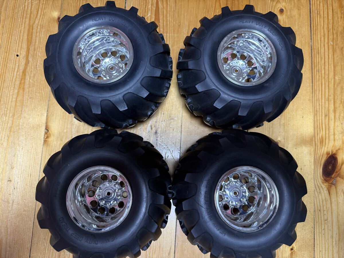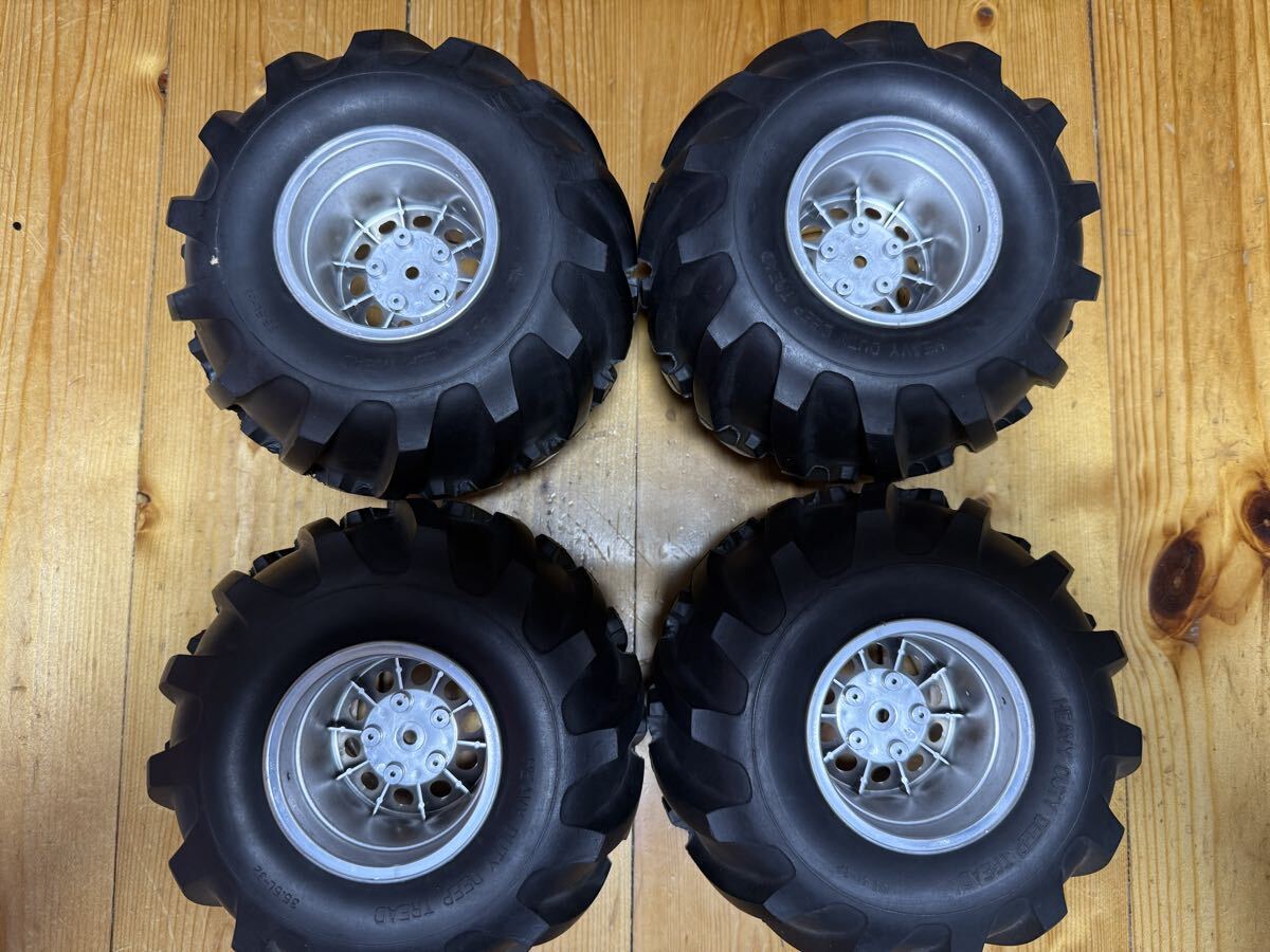 送料無料 希少 タミヤ 1/10 電動RC ジャガーノート、ジャガーノート2 のタイヤ、ホイール1台分(4本)セットです。タイヤの形状は違いますが、クラッドバスターやTXT-1にも使用できます。
