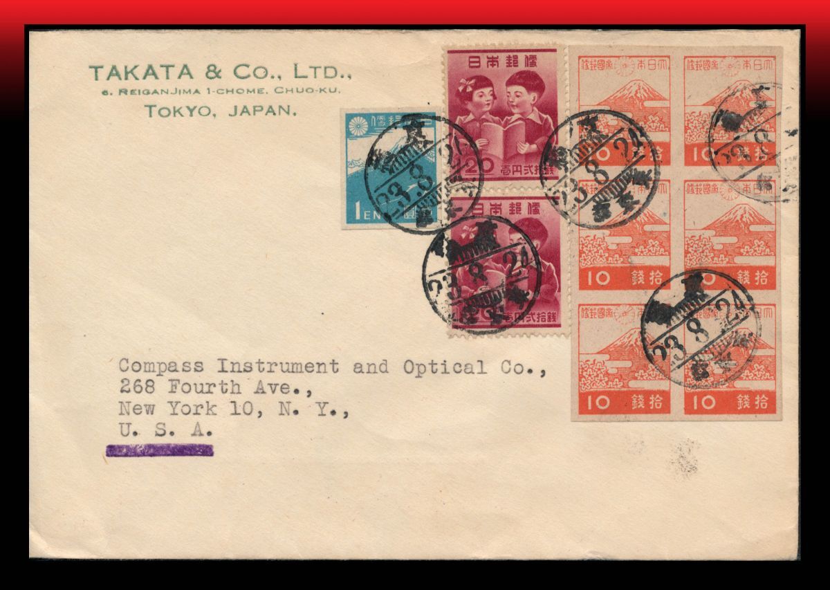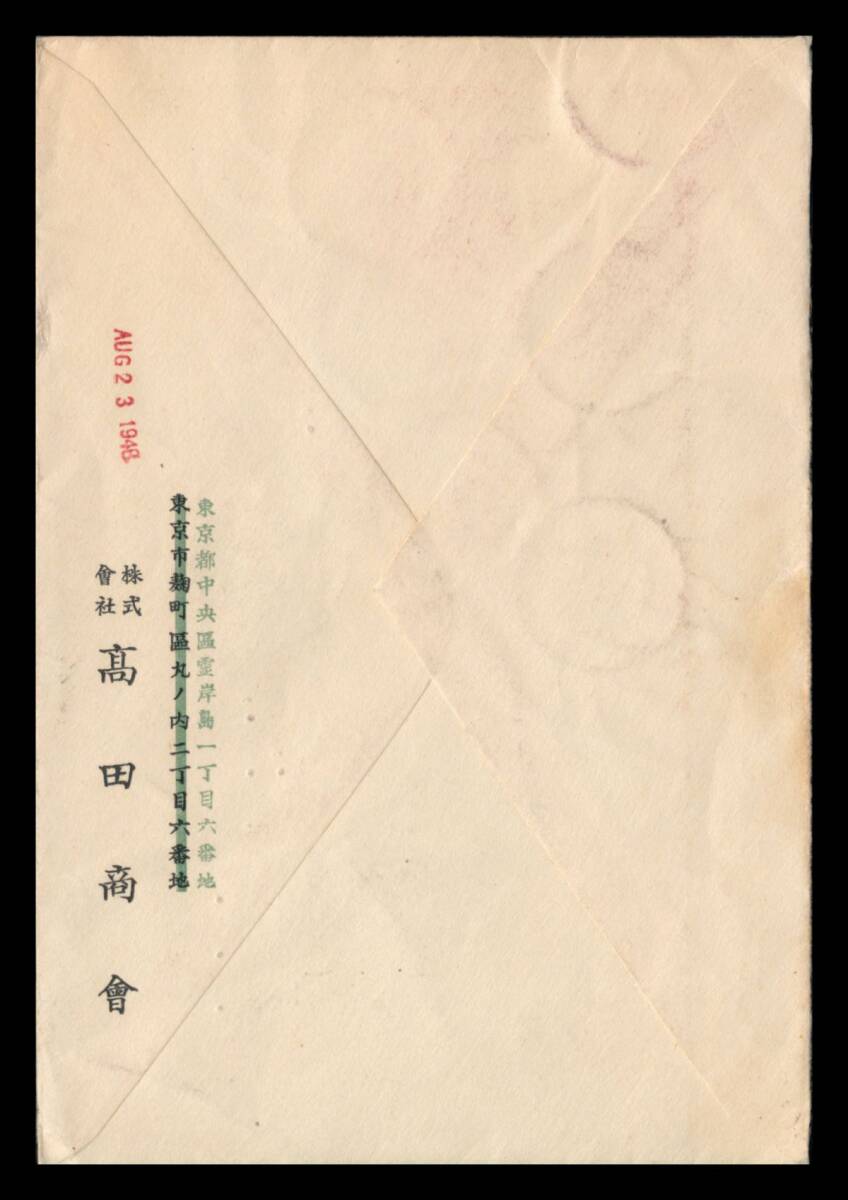 ●船便/発行年使用|教育復興運動1円20銭2枚他合計4円/米宛書状 櫛型印:京橋/23.8.24/東京都 エンタイア