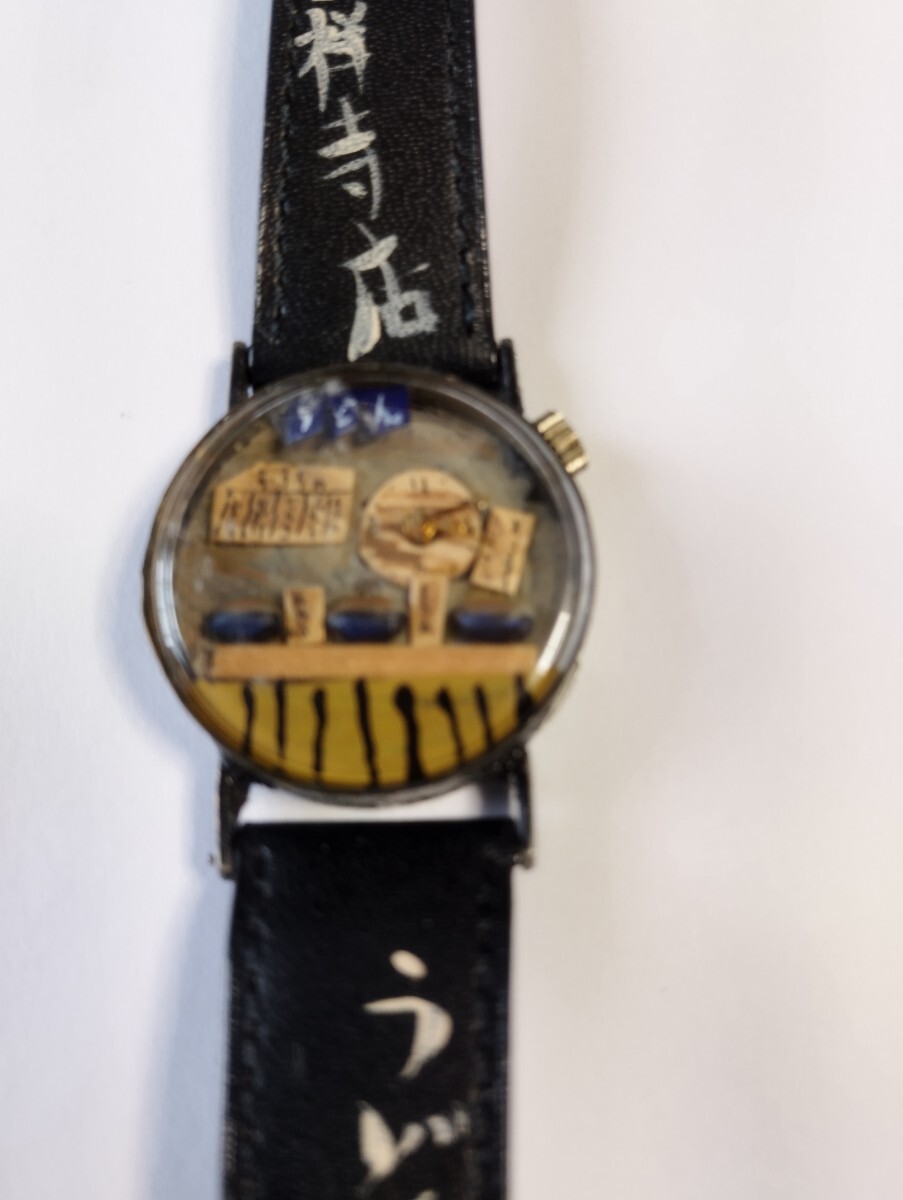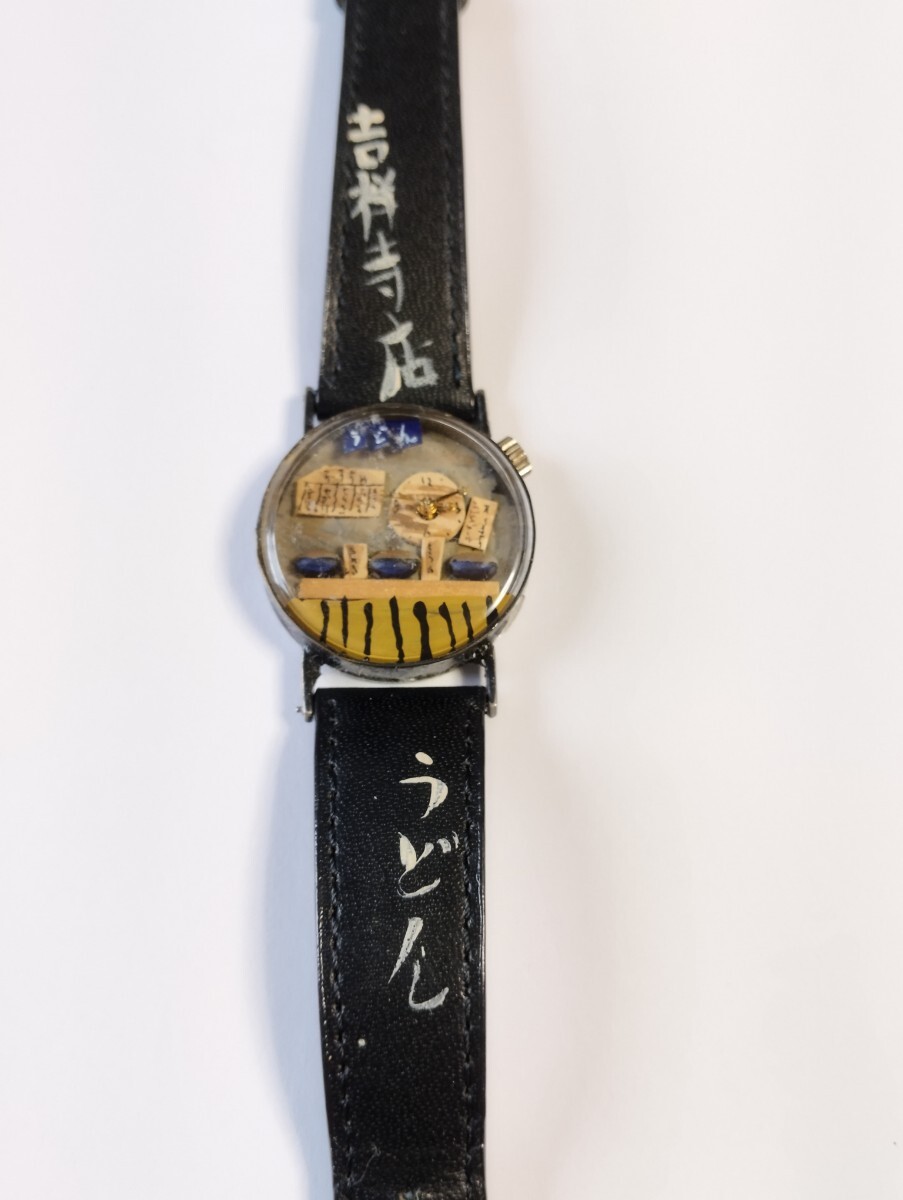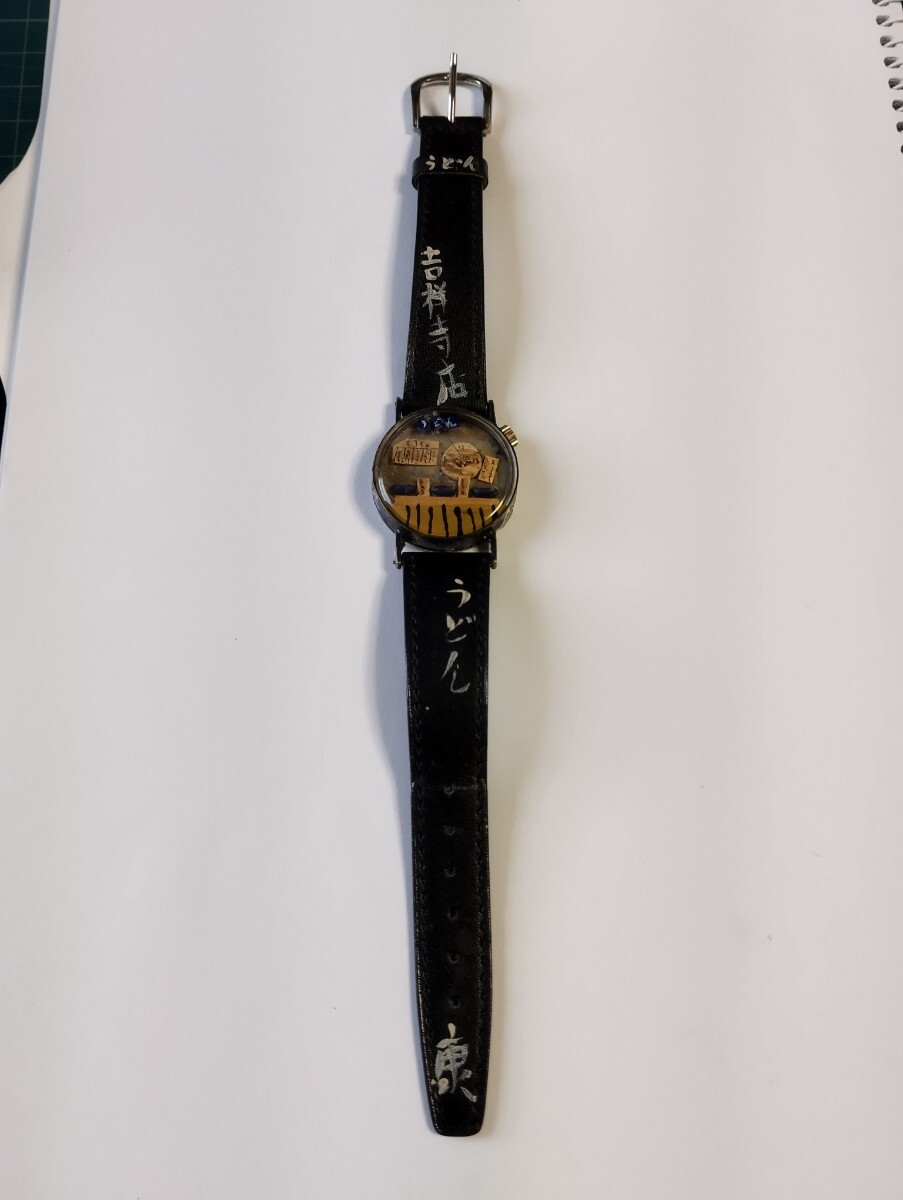 数年前に京都で購入した、うどん屋 吉祥寺店 康 キャラクター腕時計です。デザインは、うどん屋をテーマにしたユニークなキャラクターと、シンプルで上品な革バンドが特徴。限定アイテムとして、コレクターやファンにはたまらない逸品です。