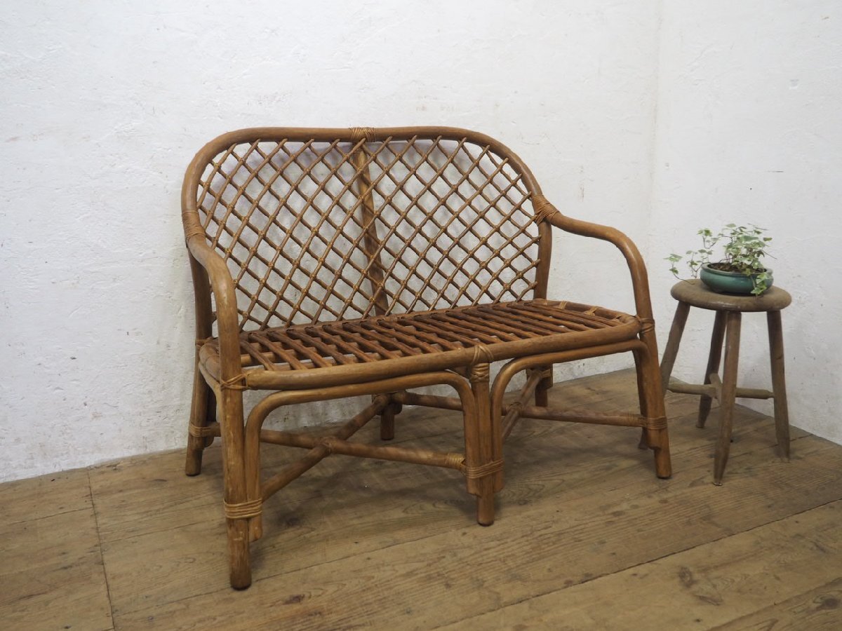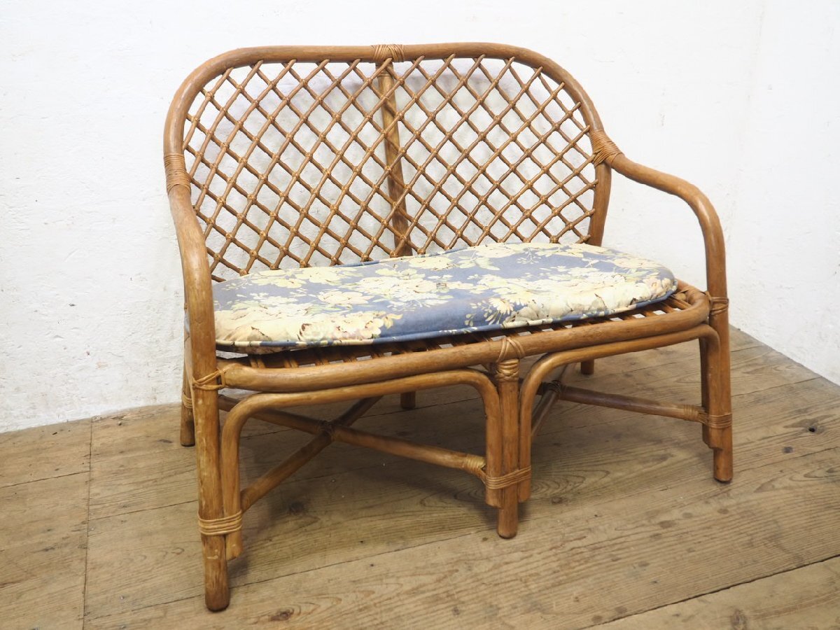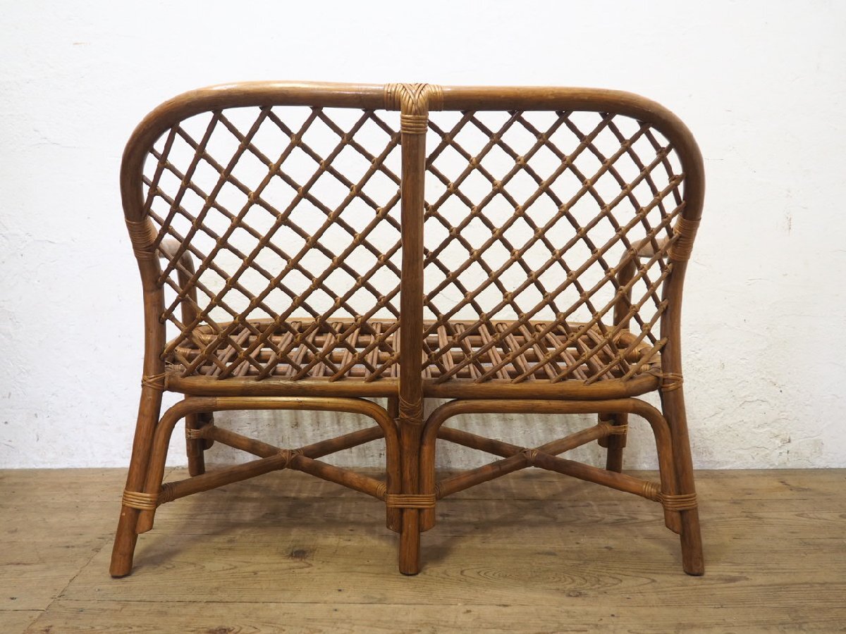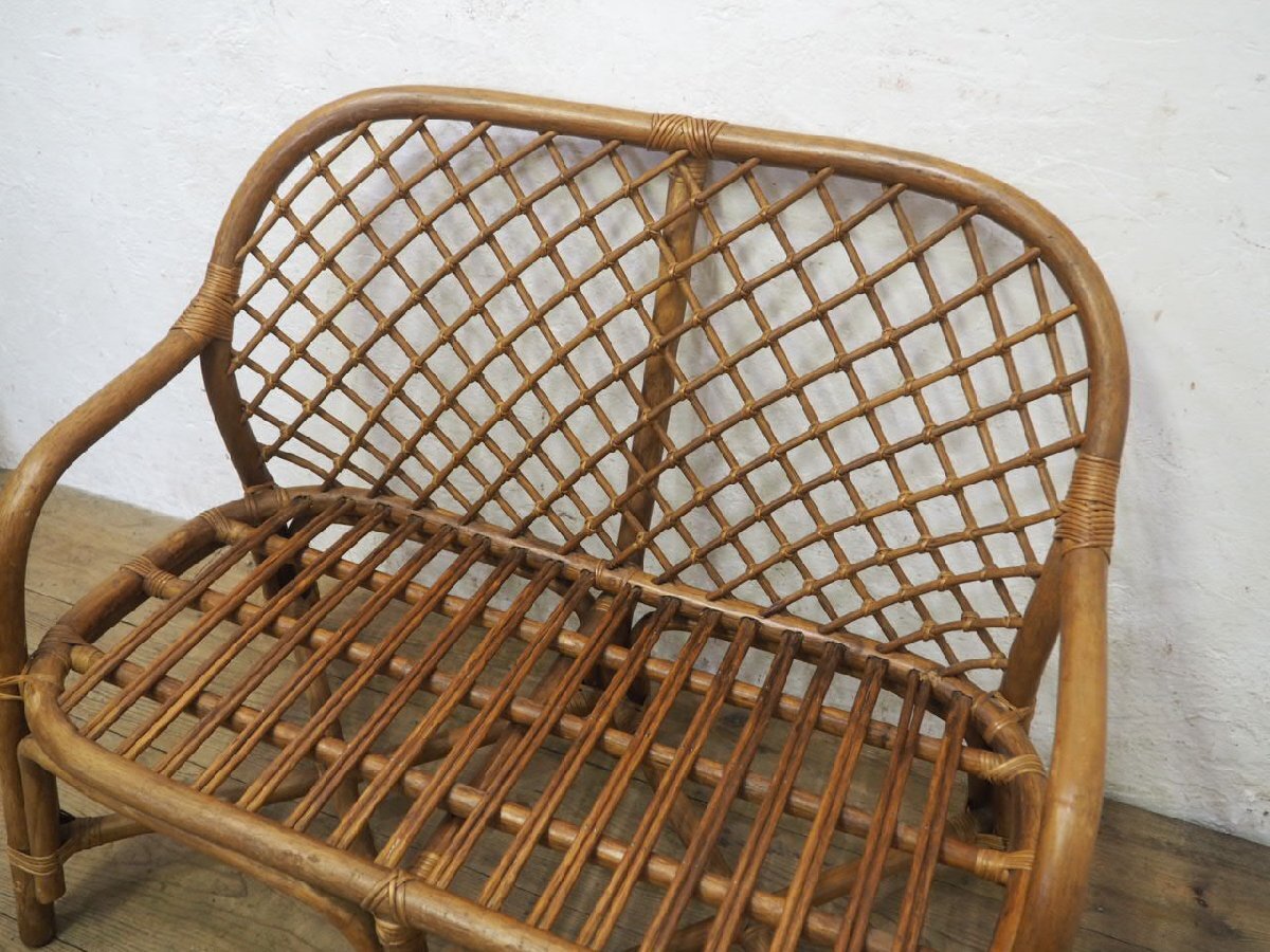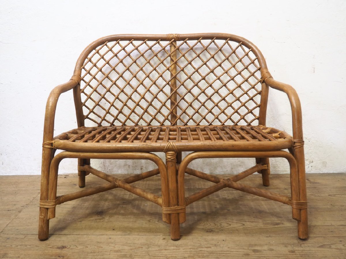 タE0843◆③可愛い籐のラブソファー◆藤 椅子 イス チェア 2人掛け 2P アームチェア レトロ リゾート カフェ 店舗什器 ビンテージR松