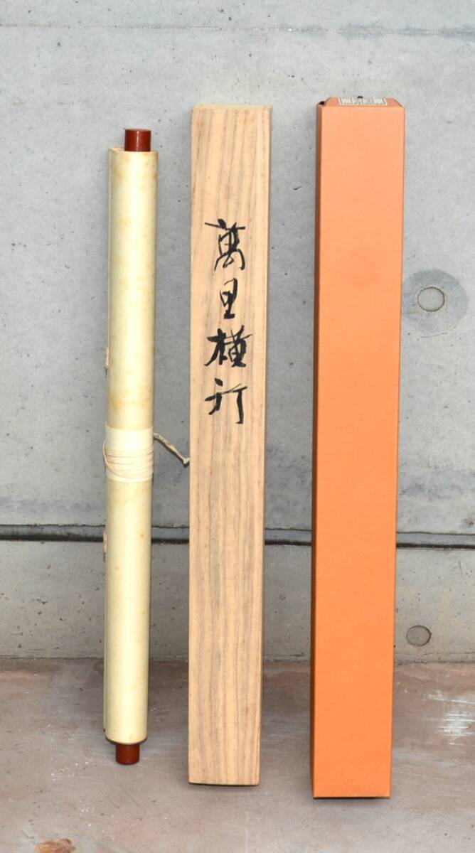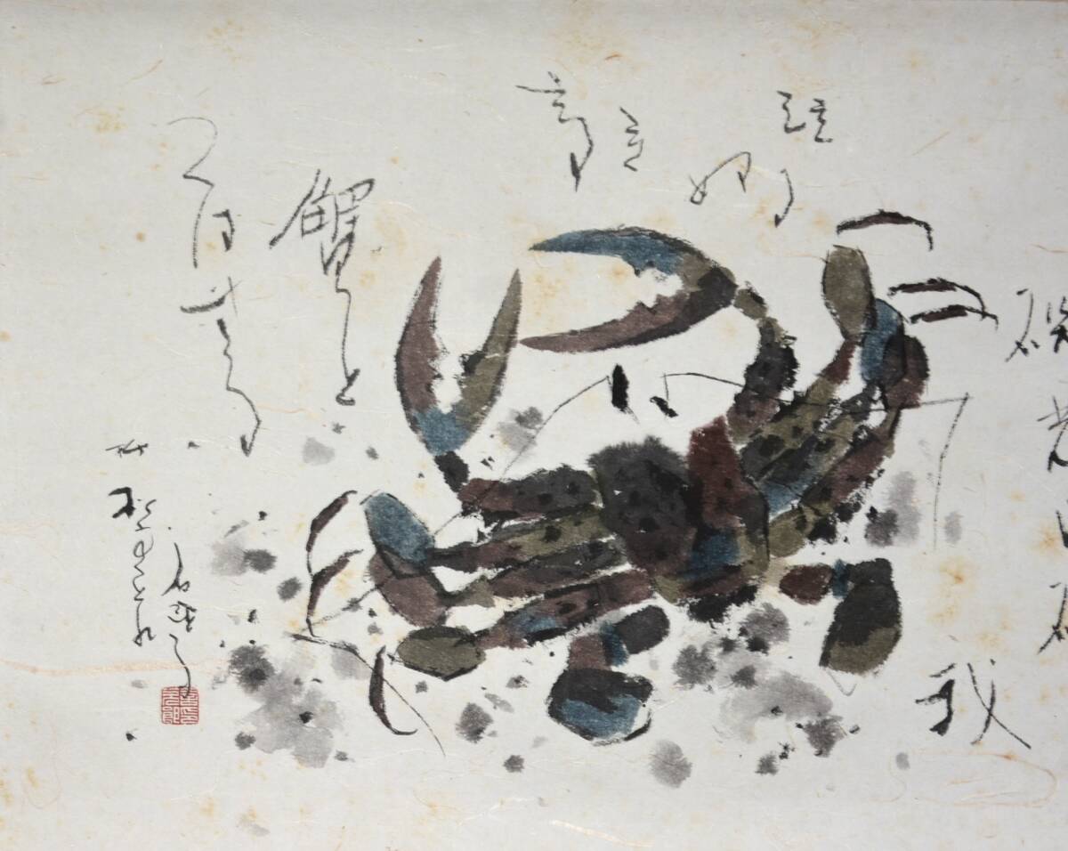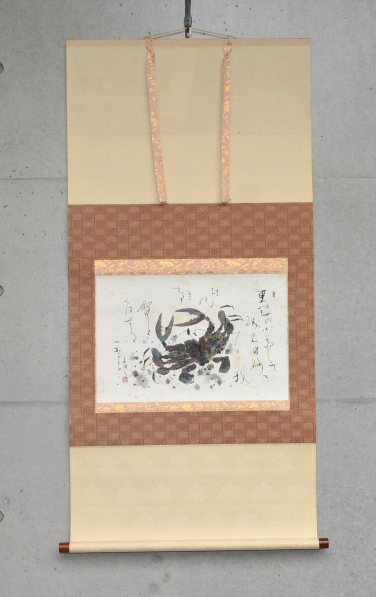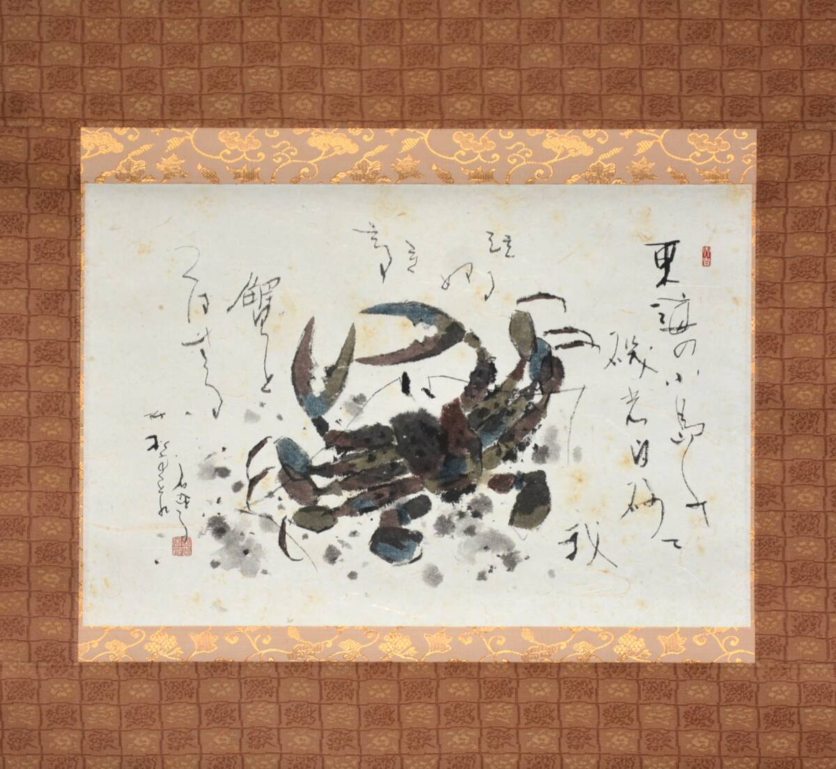 35◆初荷です ◆掛軸 鈴木石欧子 「萬里横行」 蟹画賛 真作 紙本 ◆共箱 師は小室翠雲 福岡県出身 横物