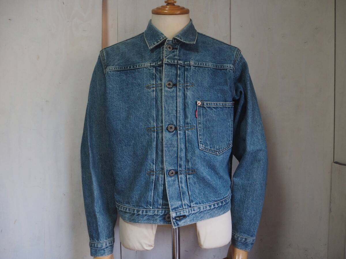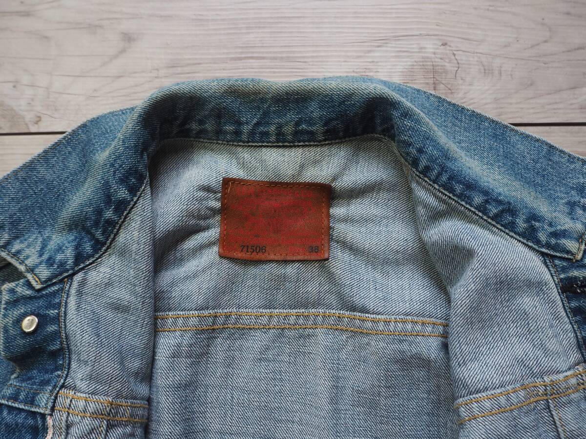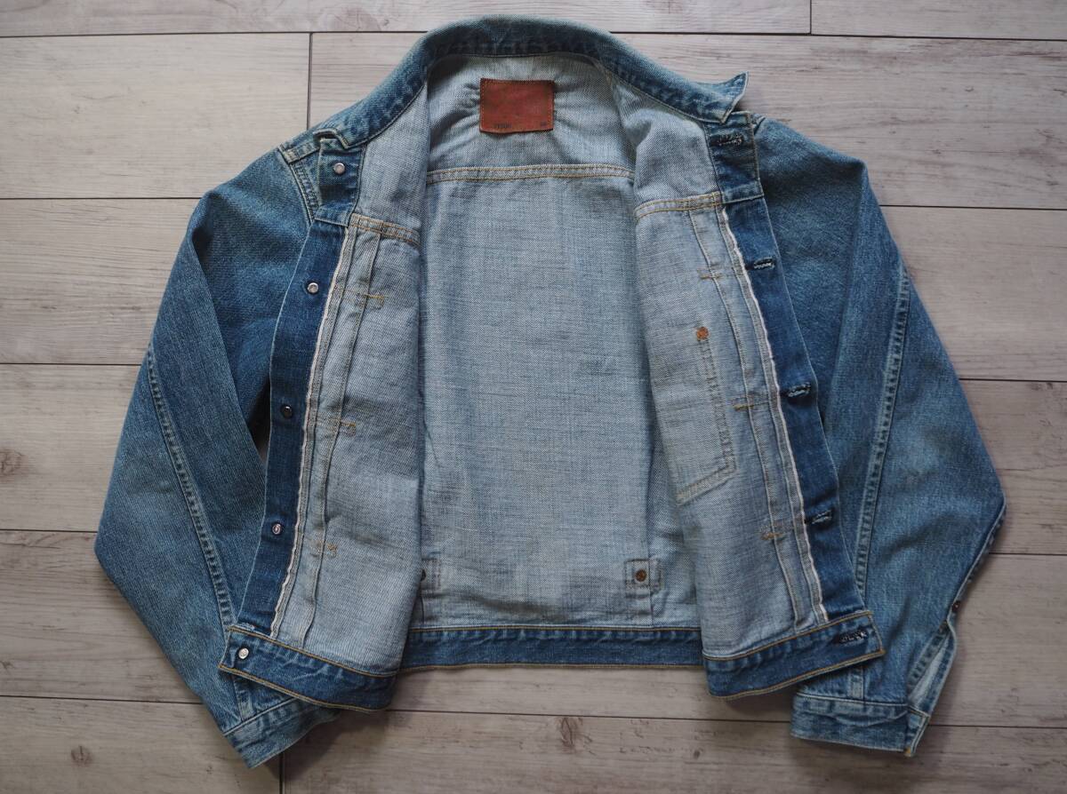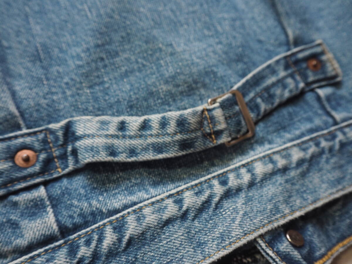 こちらはLEVI'S 71506 506xx ファーストモデル復刻デニムジャケットです。 90年代リーバイス・ジャパンによるヴィンテージアイテム。リーバイス506xxの歴史の中でもWWⅡの物資制限中、40年代前半のポケットフラップの省略された通称大戦モデルをベースに再現されています。 レザーパッチ、刻印ドーナッツボタン、刻印銅リベットやE赤タブ、見返し部の赤ミミ等、ディテールは本家そのもの。 90年代初頭で見られるざっくりとした生地感と経年による縦落ちも魅力的です。 LEVI'S 71506 506xx 1st大戦モデル復刻デニムジャケット size 38 素材 100% COTTON 赤ミミセルビッチ、シンチバッグ、ドーナッツボタン、レザーパッチ、赤タブ、等。 MADE IN JAPAN 1990年代 J02工場 実寸 身幅 56cm 肩幅 46cm 着丈 57cm 袖丈 60cm コンディション 綺麗にエイジングしており、アタリ具合も自然でいい塩梅かと思います。内タグはありませんがJ02刻印や細部ディテールより90年代アイテムです 目立つ汚れありません。保管状態も良く気持ち良く着用して頂けます。 雰囲気も楽しめるおすすめの一着です。 宜しくお願い致します。 |