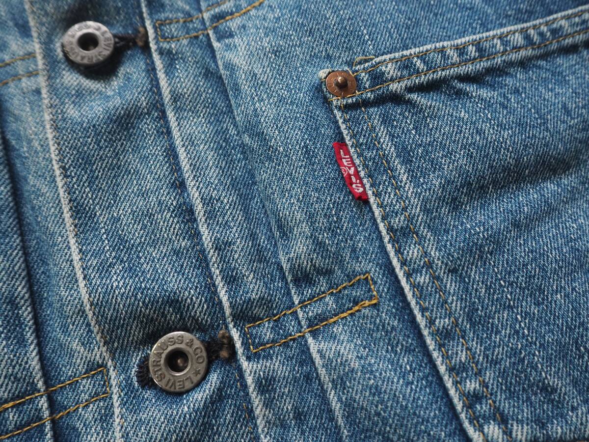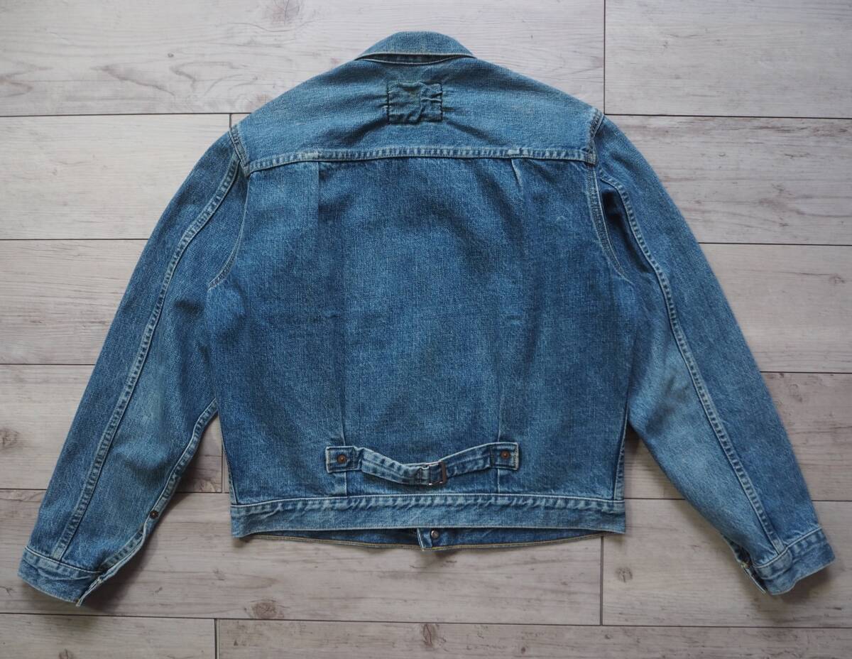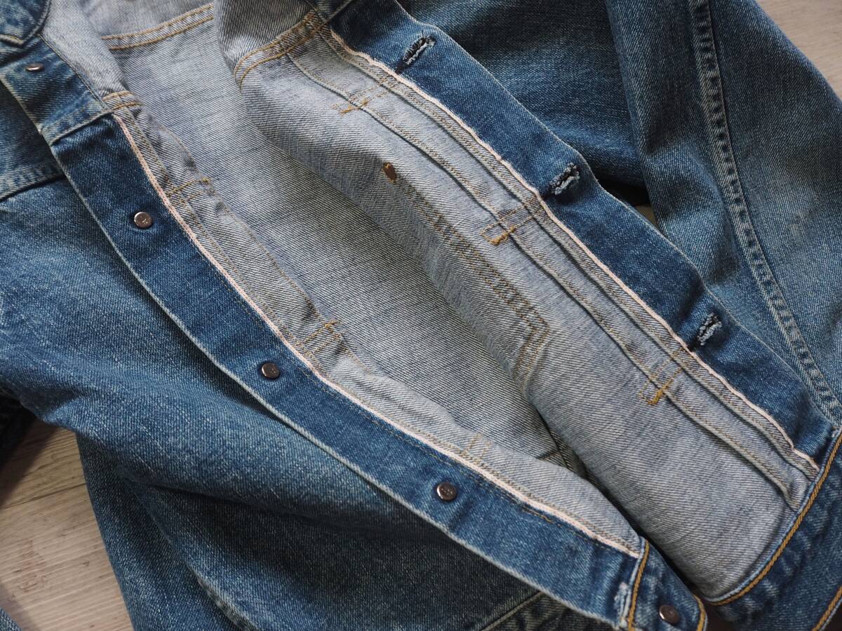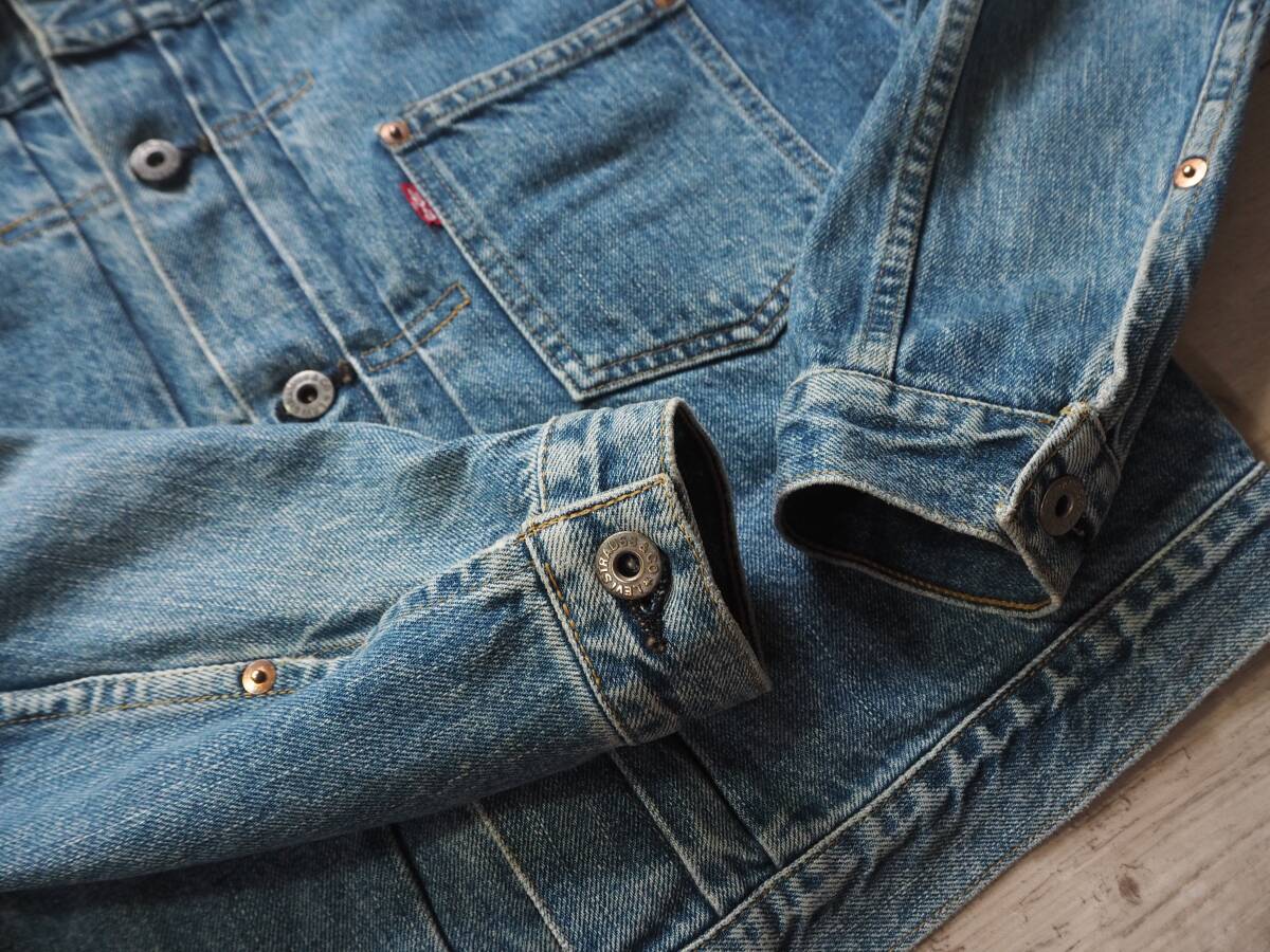こちらはLEVI'S 71506 506xx ファーストモデル復刻デニムジャケットです。 90年代リーバイス・ジャパンによるヴィンテージアイテム。リーバイス506xxの歴史の中でもWWⅡの物資制限中、40年代前半のポケットフラップの省略された通称大戦モデルをベースに再現されています。 レザーパッチ、刻印ドーナッツボタン、刻印銅リベットやE赤タブ、見返し部の赤ミミ等、ディテールは本家そのもの。 90年代初頭で見られるざっくりとした生地感と経年による縦落ちも魅力的です。 LEVI'S 71506 506xx 1st大戦モデル復刻デニムジャケット size 38 素材 100% COTTON 赤ミミセルビッチ、シンチバッグ、ドーナッツボタン、レザーパッチ、赤タブ、等。 MADE IN JAPAN 1990年代 J02工場 実寸 身幅 56cm 肩幅 46cm 着丈 57cm 袖丈 60cm コンディション 綺麗にエイジングしており、アタリ具合も自然でいい塩梅かと思います。内タグはありませんがJ02刻印や細部ディテールより90年代アイテムです 目立つ汚れありません。保管状態も良く気持ち良く着用して頂けます。 雰囲気も楽しめるおすすめの一着です。 宜しくお願い致します。 |