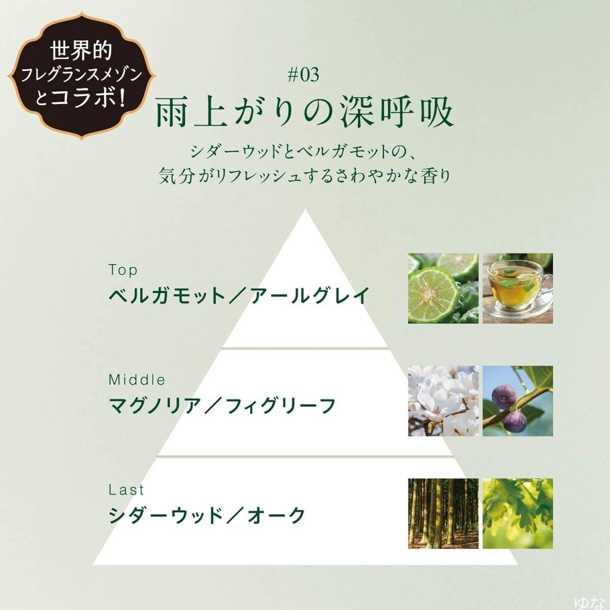 柔軟剤の香りで心ときめくシーンを再現。「雨上がりの深呼吸」:雨上がりの針葉樹林。そよ風に揺れる木漏れ日の下で、深呼吸する。立ち昇るシダーウッドの香りと爽やかなベルガモットの香りに満たされる。