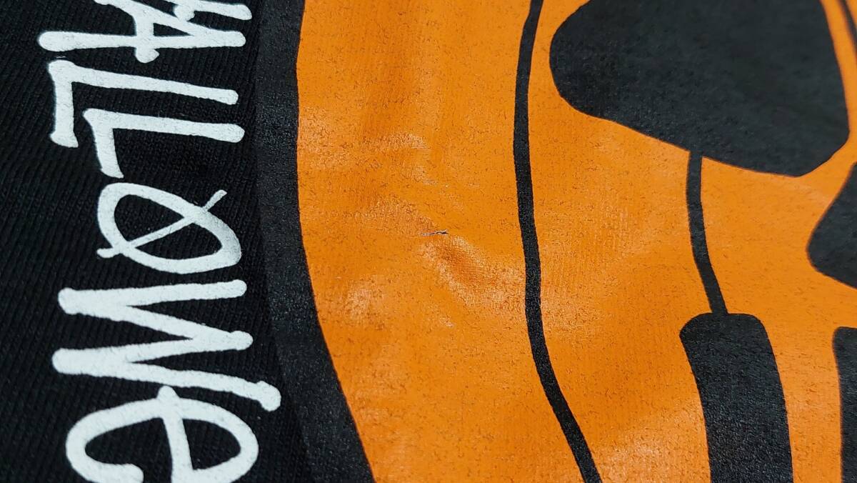 検品したところ私見では御座いますがフロントプリント ジャックオーランタンの右頬に二箇所 約4mm程度のプリント割れが御座います。(画像5参照)