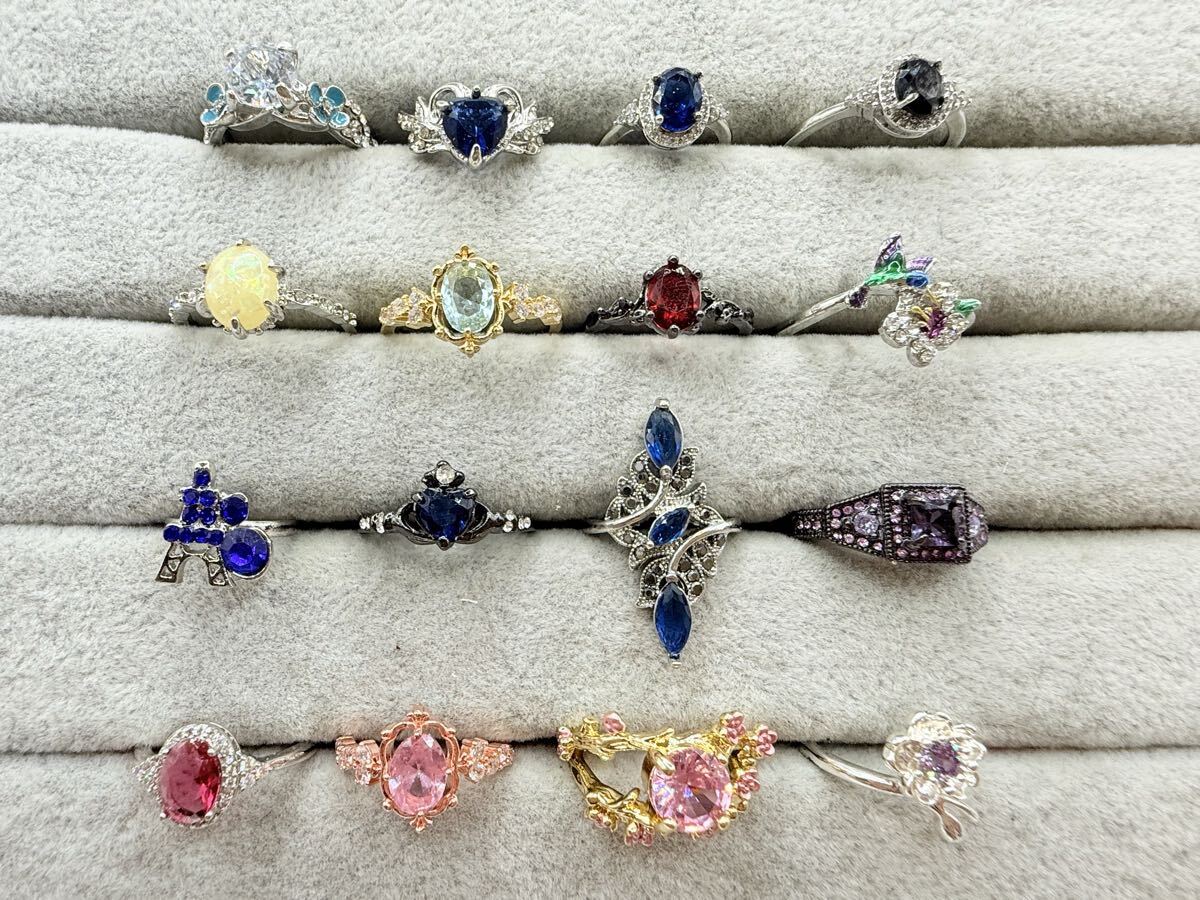 天然石、ジルコニア 、カラーストーン、色ガラス、ゴールド、シルバー、ステンレス、真鍮など様々です。