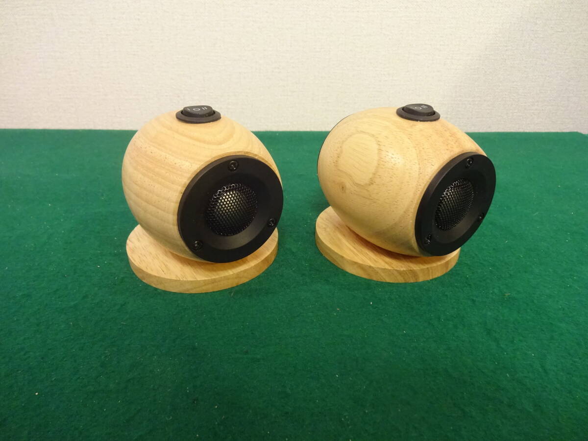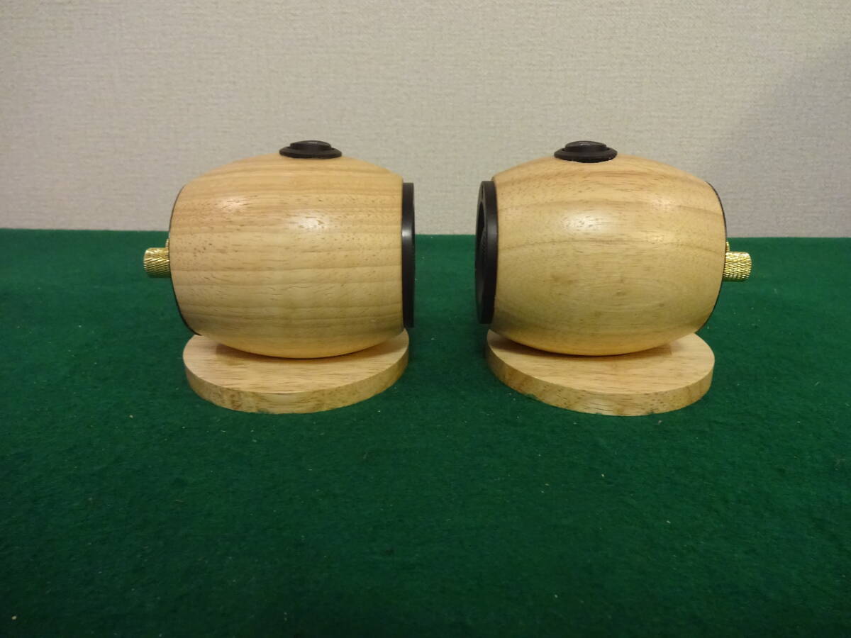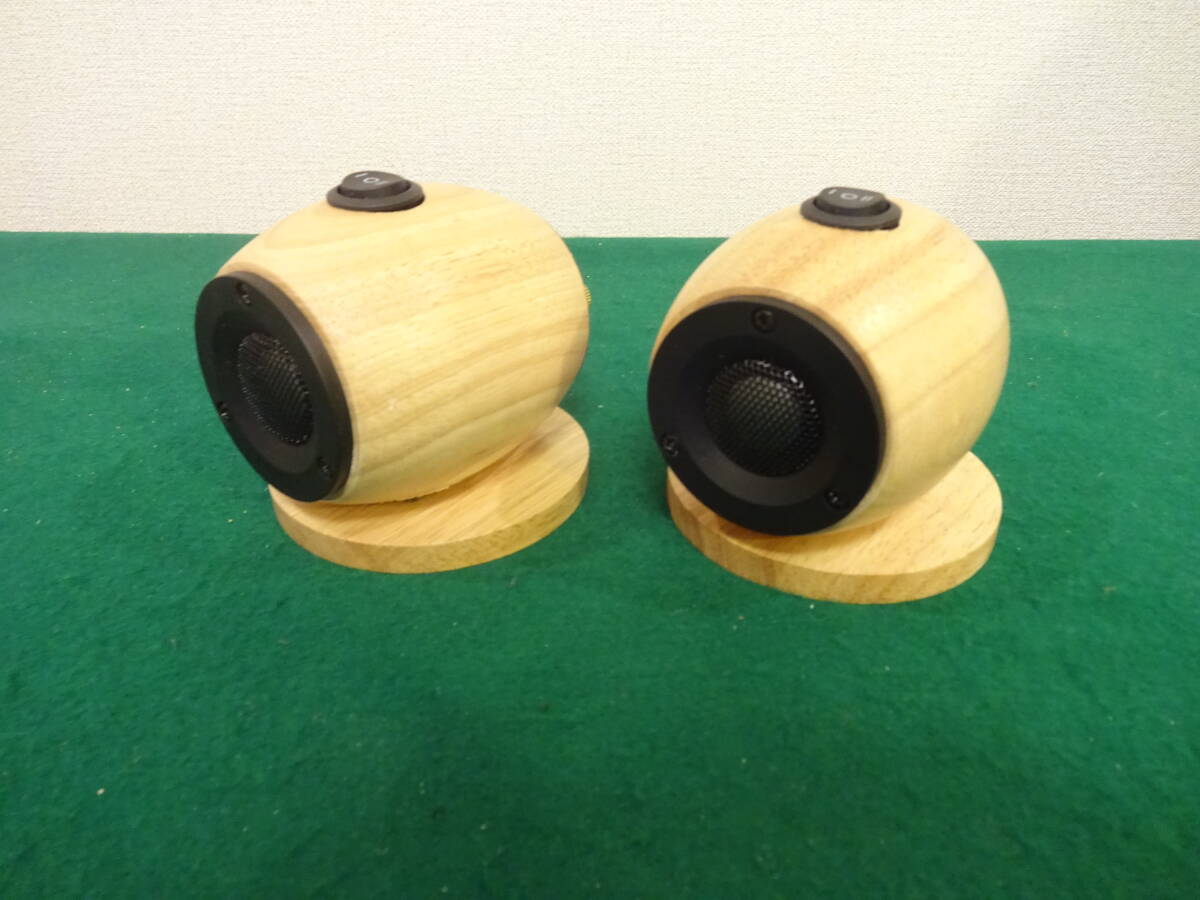 このスピーカーは天然木を削り出したものでタマゴ型の外形となっています。