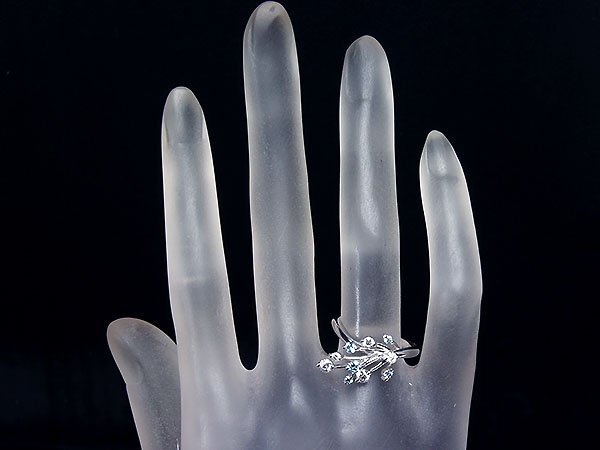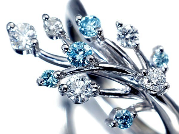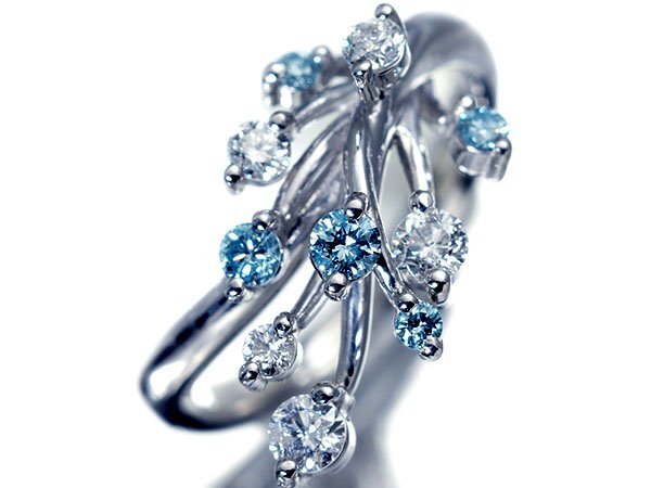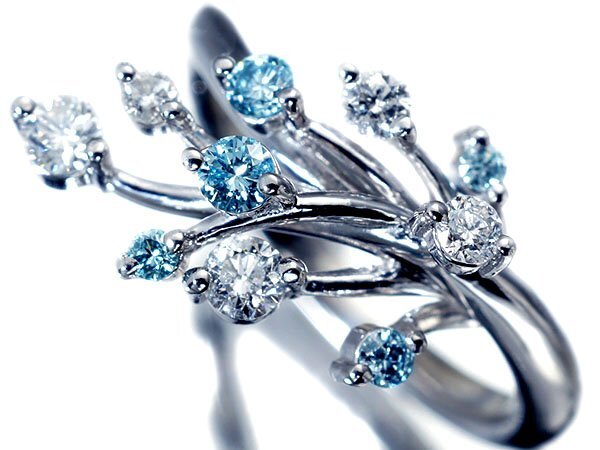 可憐な植物デザインに天然アイスブルーダイヤモンド&天然クリアダイヤモンド総計0.52ctを素敵に宝飾した、高級Pt900リングを1円から特別大放出致します!