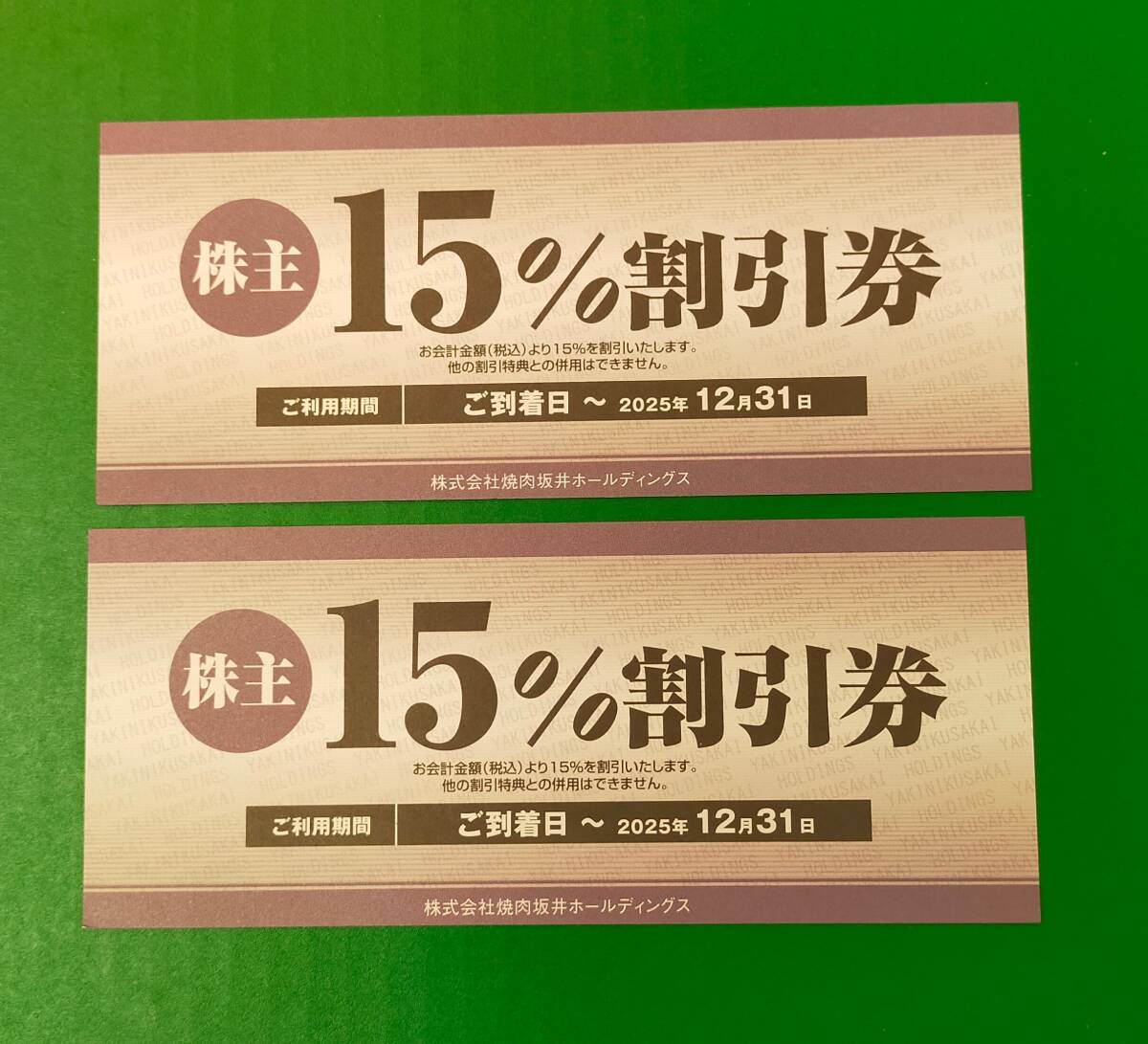 株主優待焼肉坂井ホールディングス割引券です。 15%割引券2枚になります。