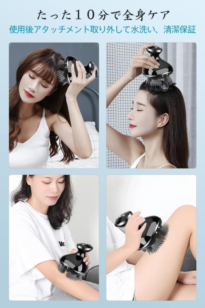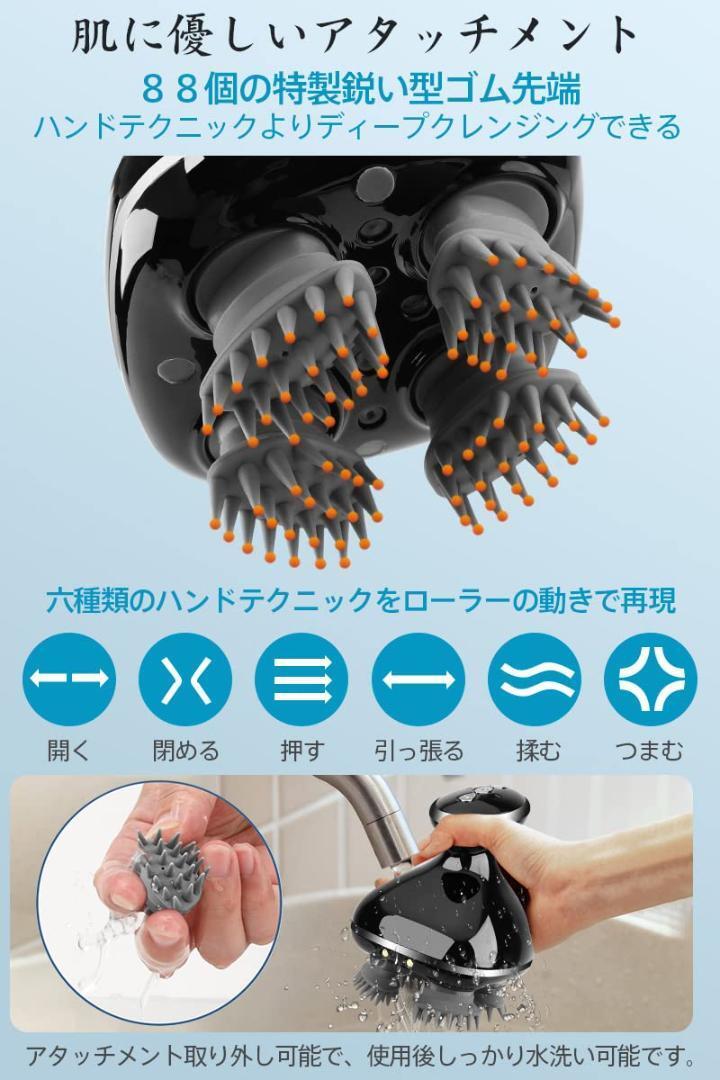 【88個特製先端ブラシで持ちやすいハンドル】特製ブラシは4個あります。1個のブラシの22個のゴム先端があり、合計88個の先端があります。ブラシの動きは外側から内側までの往復動作で、頭皮をしっかり洗浄することができます。更に2段階のスピードを選択できます。