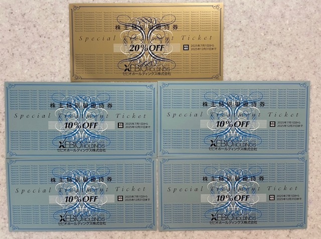 20%割引優待券1枚 + 10%割引優待券4枚のセットです。