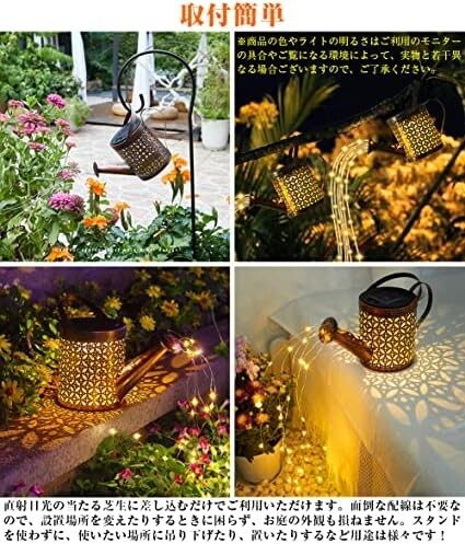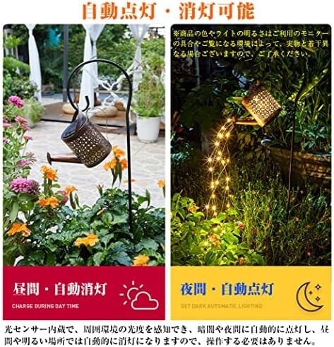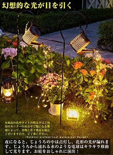 • 【幻想的な光が目を引く】夜になると、じょうろの中は点灯し、花形の光が漏れます。じょうろから流れる水のような電球はキラキラ移動して光ります。さらに、水の部分のライトは自由に形を変えることができるので、場所と気分で変えられます。