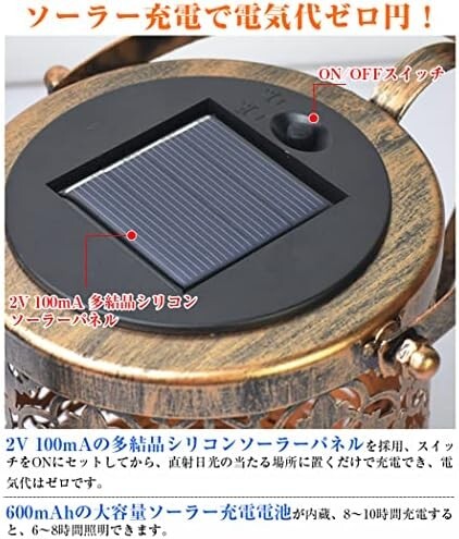 【省エネ】2V 100mAの多結晶シリコンソーラーパネルを採用、スイッチをONにセットしてから、直射日光の当たる場所に置くだけで充電でき、電気代はゼロです。600mAhの大容量ソーラー充電電池が内蔵、8~10時間充電すると、6~8時間照明できます。