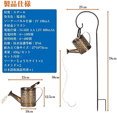 ソーラーじょうろライト 2個セット スタンド付 ジョウロ ガーデンライト 自動点灯 電球色 屋外 防水 装飾用 ソーラーライト ソーラーランタン 置物ライト LEDライト 配線不要 おしゃれ 日本語説明書付
