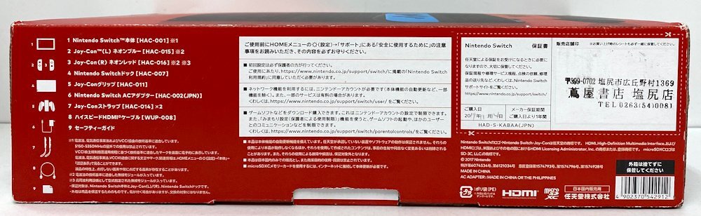 ★任天堂 Nintendo Switch 本体 / Joy-Con (L) ネオンブルー (R) ネオンレッド / 中古★ ■商品状態など 【型番】HAC-001 【付属品】セーフティガイド欠品 【本体 Ver.】20.4.0 【本体状態】本体、画面に割れなどの大きな傷はありませんが、 キズ、スレは全体的にあります。 動作確認後初期化を行った使用品の中古品となります 外箱には多少のイタミが見られます ━━━━━━━━━━━━━━━━━━━━━━━━━━━━━ ■他にも様々な出品物がありますので、是非ご覧ください■ ━━━━━━━━━━━━━━━━━━━━━━━━━━━━━ ◆おたちゅーYO 出品一覧◆ (別窓で開きます) ――◆――■――◆― 諸注意 ―■――◆――■―― なるべく詳細な商品状態をお伝えすることを心掛けておりますが、 見落としてしまった若干のキズやスレ、凹みや破れ、 写真ではわかりづらいイタミ、 写真に写っていない面のキズ、イタミなどがある場合があります。 お使いのモニターやWebブラウザーなどの状況により、 実際の商品との色合いの印象が多少異なる場合があります。 添付写真に写っていないものや、 商品説明欄等に記載のない付属品などは付属いたしません。 当店の商品は全て実店舗にてご来店のお客様からの買取品となりますので 未開封・未使用品であっても 中古品であるという点にご留意ください。 少なくとも一度は人の手に渡った物ですので、 神経質な方は入札をご遠慮ください。 万が一商品タイトルと商品画像相違がある場合は画像優先となります。 不明な点がございましたら、必ずご入札前にご質問ください。 質問など無く落札された場合は、 全てご納得されているとみなしますので、 落札後に改めて確認などをされても、対応しかねる場合があります。 ――■――◆――■――◆――■――◆――■――◆―― |