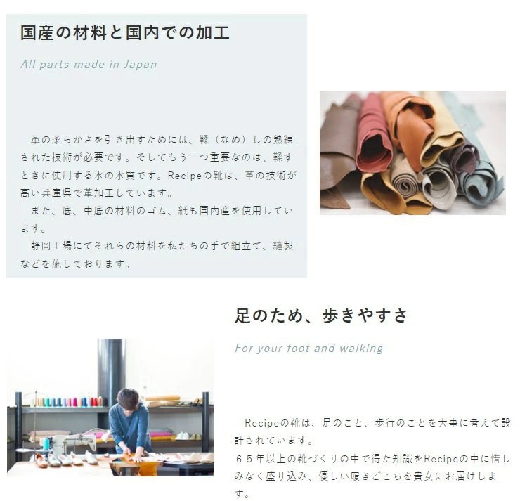 65年以上の靴づくりの中で得た知識をRecipeの中に惜しみなく盛り込み、優しい履きごこちを貴女にお届けします。