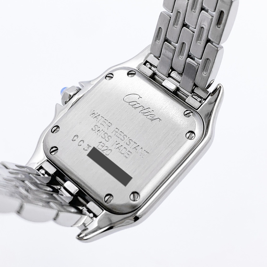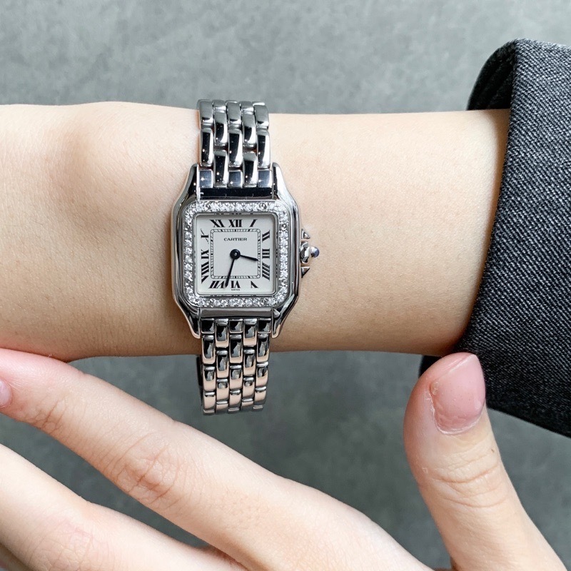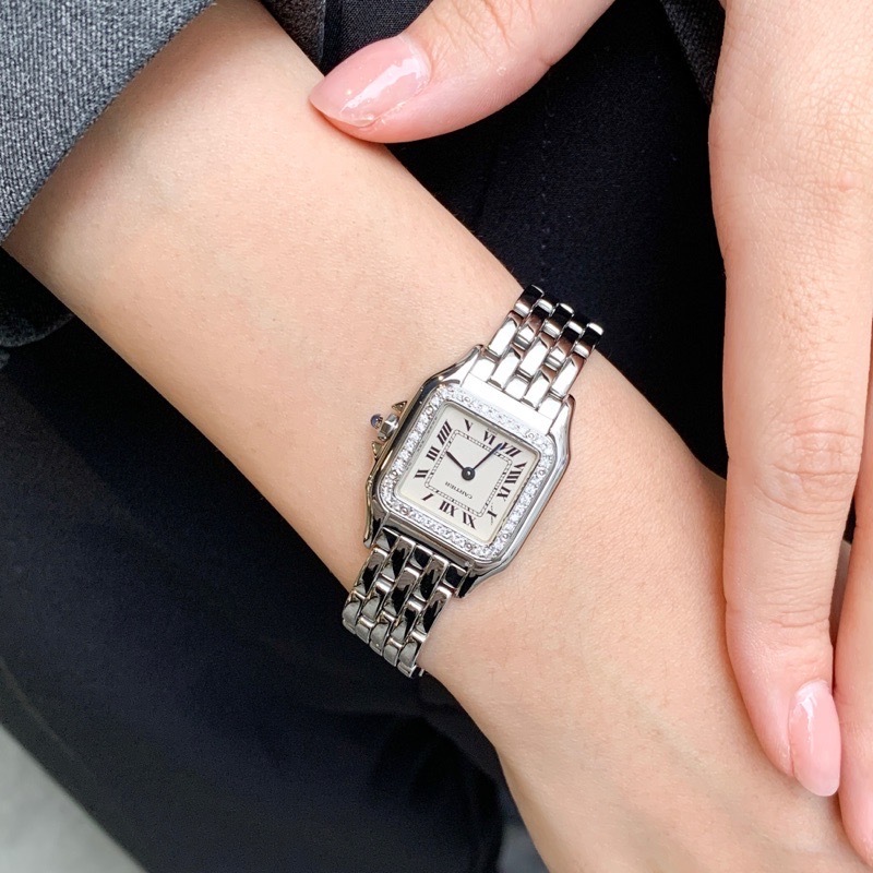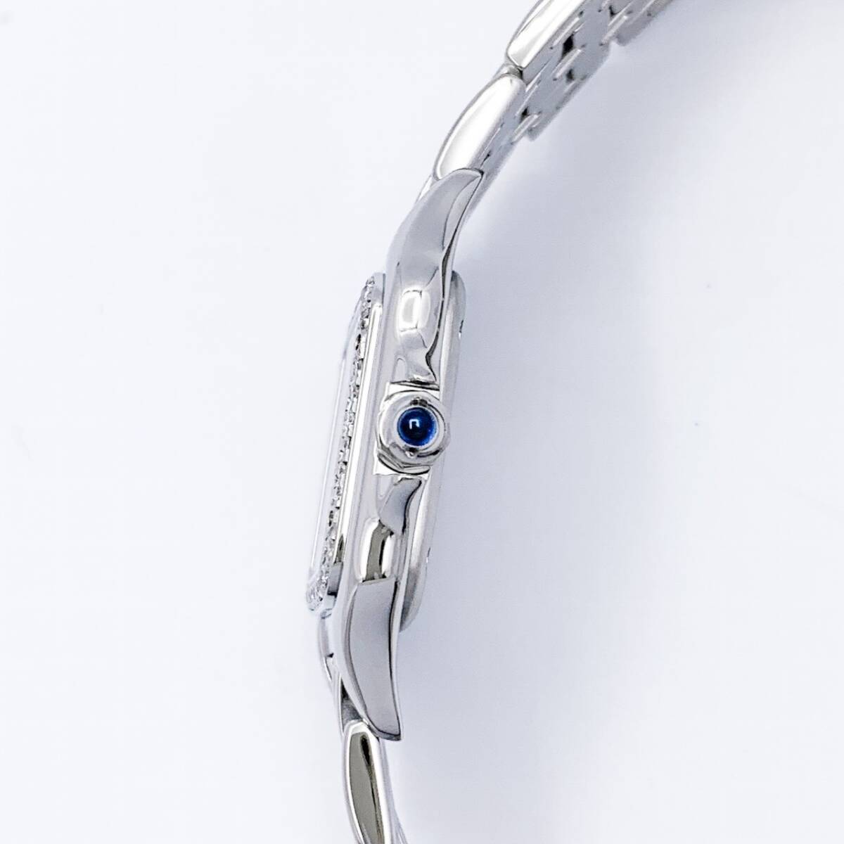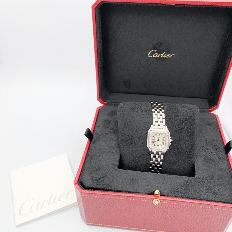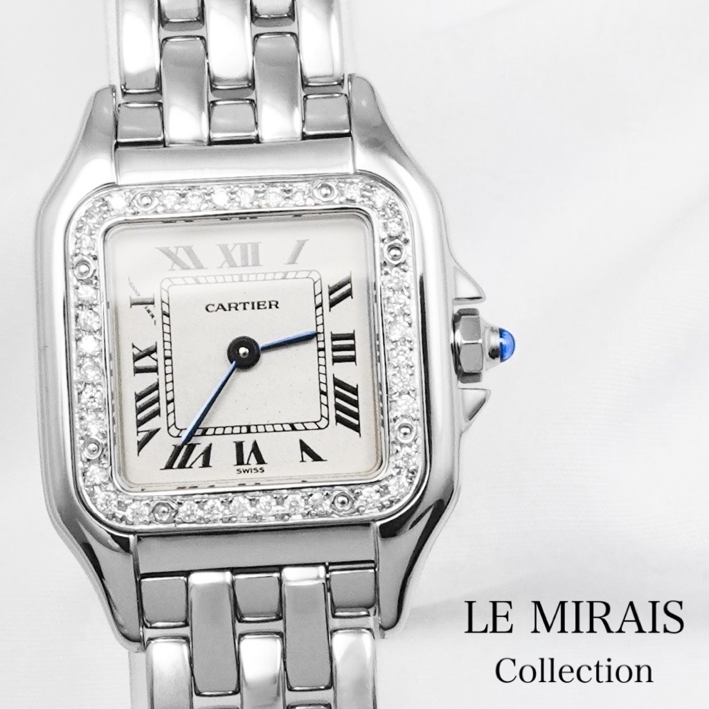 1983年に誕生し不動の人気を誇る《パンテール ドゥ カルティエ》 ベゼルにシンプルに施されたダイヤモンドと、繊細なブレスデザインが気品のある腕元を演出。 オケージョンからカジュアルスタイルまで幅広く合わせやすく、日常のスタイルに彩りを与える。 当店職人、一級時計修理技能士によるオーバーホール、点検、外装仕上済みで安心してご愛用いただけます。こちらの商品は、文字盤に小さな黒い点のように見える部分がございます。状態の詳細は1枚目の写真をご確認ください。全体的には美しいコンディションを保っております。